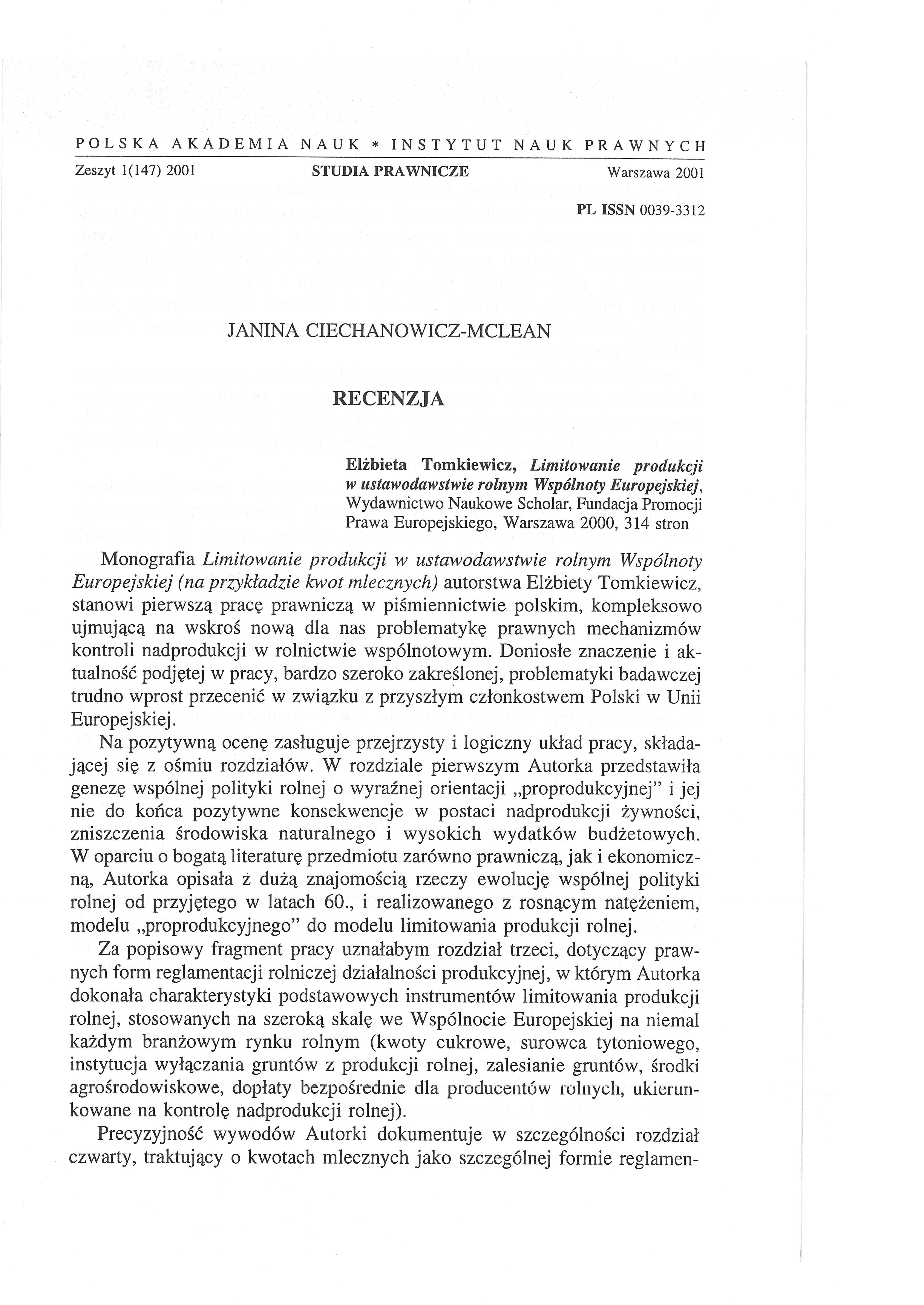 Book review of monographs by Elżbieta Tomkiewicz, Limitowanie produkcji w ustawodawstwie rolnym Wspólnoty Europejskiej na przykładzie kwot mlecznych, Wydawnictwo Naukowe Scholar, Fundacja Promocji Prawa Europejskiego, Warszawa 2000.