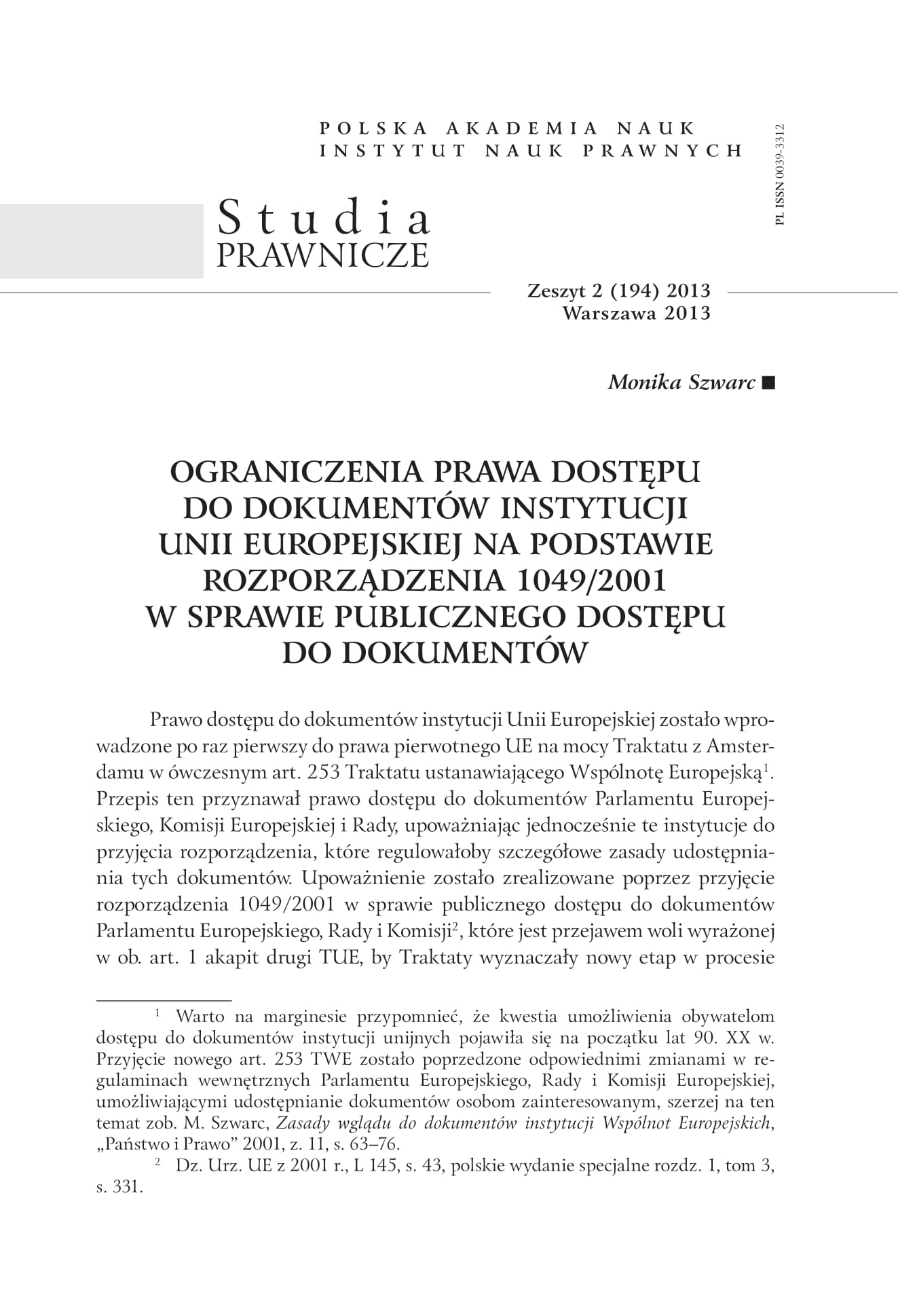 - Szwarc M., Zasady wglądu do dokumentów instytucji Wspólnot Europejskich, „Państwo i Prawo” 2001, nr 11, s. 63–76.