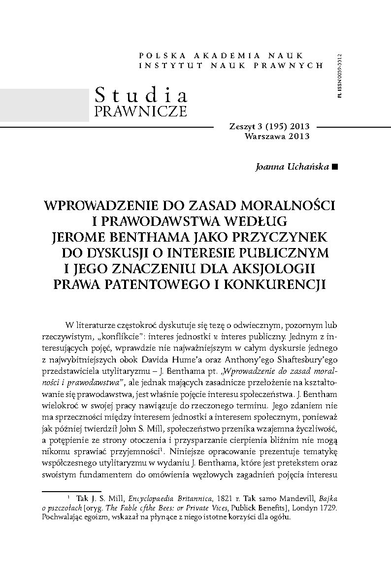 W literaturze częstokroć dyskutuje się tezę o odwiecznym, pozornym lub rzeczywistym, „konflikcie”: interes jednostki v. interes publiczny. Jednym z interesujących pojęć, wprawdzie nie najważniejszym w całym dyskursie jednego z najwybitniejszych obok Davida Hume’a oraz Anthony’ego Shaftesbury’ego przedstawiciela utylitaryzmu – J. Benthama pt. „Wprowadzenie do zasad moralności i prawodawstwa”, ale jednak mających zasadnicze przełożenie na kształtowanie się prawodawstwa, jest właśnie pojęcie interesu społeczeństwa. J. Bentham wielokroć w swojej pracy nawiązuje do rzeczonego terminu. Jego zdaniem nie ma sprzeczności między interesem jednostki a interesem społecznym, ponieważ jak później twierdził John S. Mill, społeczeństwo przenika wzajemna życzliwość, a potępienie ze strony otoczenia i przysparzanie cierpienia bliźnim nie mogą nikomu sprawiać przyjemności. Niniejsze opracowanie prezentuje tematykę współczesnego utylitaryzmu w wydaniu J. Benthama, które jest pretekstem oraz swoistym fundamentem do omówienia węzłowych zagadnień pojęcia interesu publicznego i jego rozumienia na tle podstaw aksjologicznych prawa konkurencji oraz prawa patentowego, nade wszystko, odwołując się do zasady proporcjonalności (w oparciu o teorię jedności opisującą relację interesu publicznego i prywatnego), która jest kluczem do rozwiązania pozornego styku, a wręcz konfliktu między prawem konkurencji a prawem własności intelektualnej. Reguła proporcjonalności ukazuje się zatem bez wątpienia jako narzędzie współczesnego utylitaryzmu.