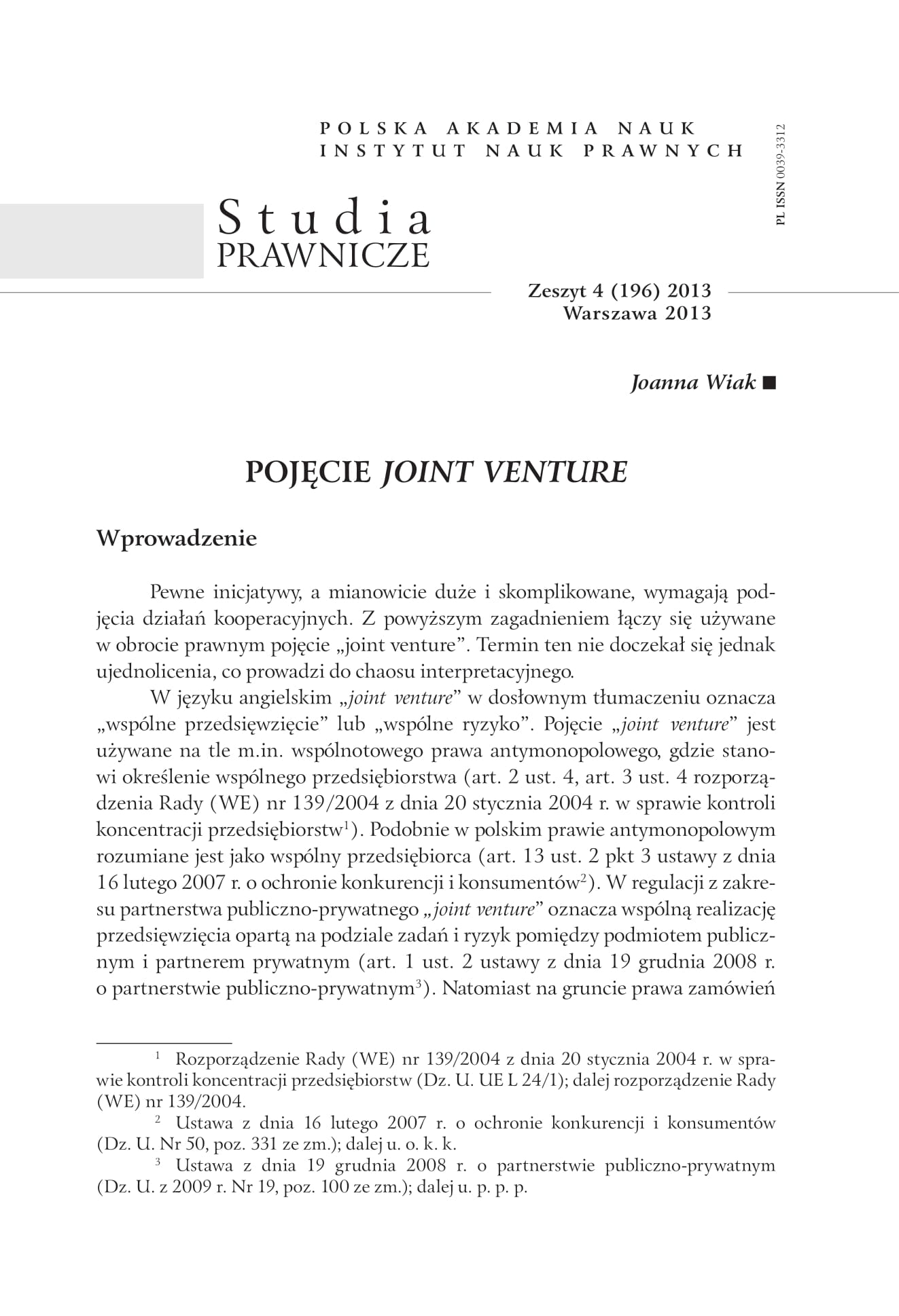 W języku angielskim „joint venture” w dosłownym tłumaczeniu oznacza „wspólne przedsięwzięcie” lub „wspólne ryzyko”. Pojęcie „joint venture” jest używane na tle m.in. wspólnotowego prawa antymonopolowego, gdzie stanowi określenie wspólnego przedsiębiorstwa (art. 2 ust. 4, art. 3 ust. 4 rozporządzenia Rady (WE) nr 139/2004 z dnia 20 stycznia 2004 r. w sprawie kontroli koncentracji przedsiębiorstw). Podobnie w polskim prawie antymonopolowym rozumiane jest jako wspólny przedsiębiorca (art. 13 ust. 2 pkt 3 ustawy z dnia 16 lutego 2007 r. o ochronie konkurencji i konsumentów). W regulacji z zakresu partnerstwa publiczno-prywatnego „joint venture” oznacza wspólną realizację przedsięwzięcia opartą na podziale zadań i ryzyk pomiędzy podmiotem publicznym i partnerem prywatnym (art. 1 ust. 2 ustawy z dnia 19 grudnia 2008 r. o partnerstwie publiczno-prywatnym). Natomiast na gruncie prawa zamówień publicznych funkcjonuje pojęcie „spółki joint venture z udziałem podmiotów zamawiających” oznaczające spółkę posiadającą podmiotowość prawną, utworzoną przez zamawiających (pkt 32 preambuły, art. 23 ust. 2 lit. b), ust. 4 lit. a) Dyrektywy Parlamentu Europejskiego i Rady nr 2004/17/WE z dnia 31 marca 2004 r. koordynującej procedury udzielania zamówień w sektorach gospodarki wodnej, energetyki, transportu i usług pocztowych w zw. z art. 136 ustawy z dnia 29 stycznia 2004 r. – Prawo zamówień publicznych).