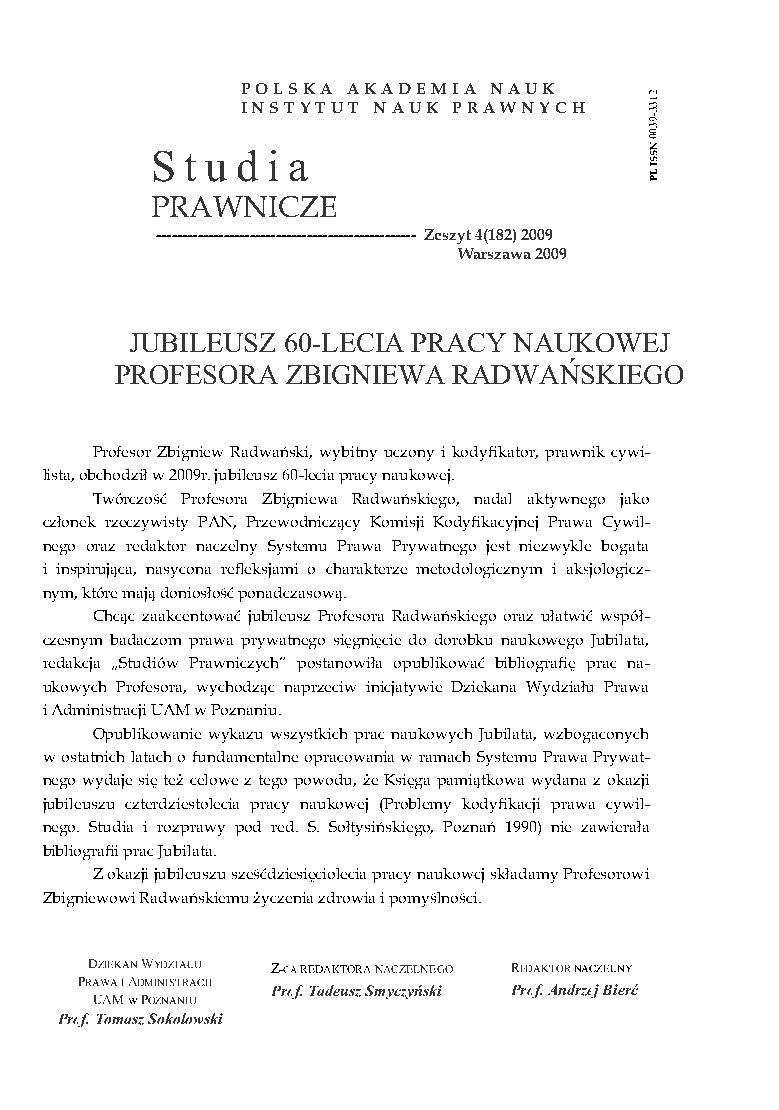 Profesor Zbigniew Radwański, wybitny uczony i kodyfikator, prawnik cywilista, obchodził w 2009 r. jubileusz 60-lecia pracy naukowej.
