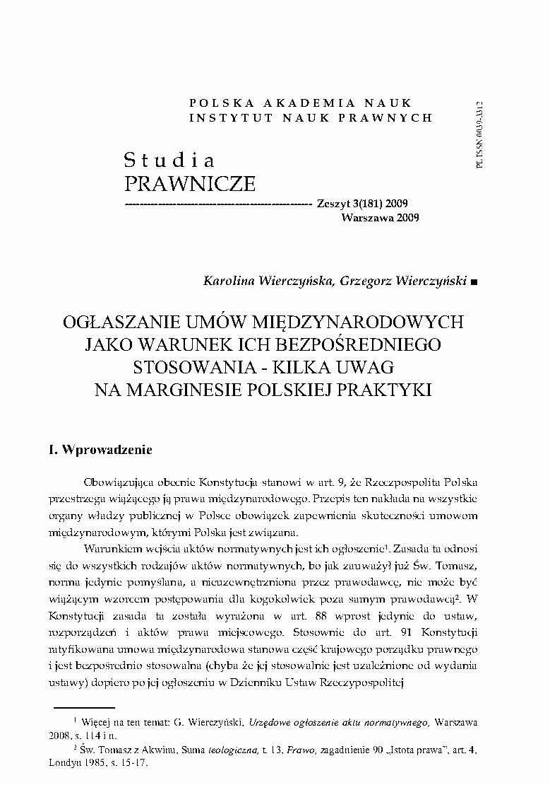 Ogłaszanie umów międzynarodowych jako warunek ich bezpośredniego stosowania - kilka uwag na marginesie polskiej praktyki: [Official publication of international agreements as a condition of their direct effectiveness - few remarks concerning]. (2009). Studia Prawnicze The Legal Studies, 3 (181), 5-23. https://doi.org/10.37232/sp.2009.3.1