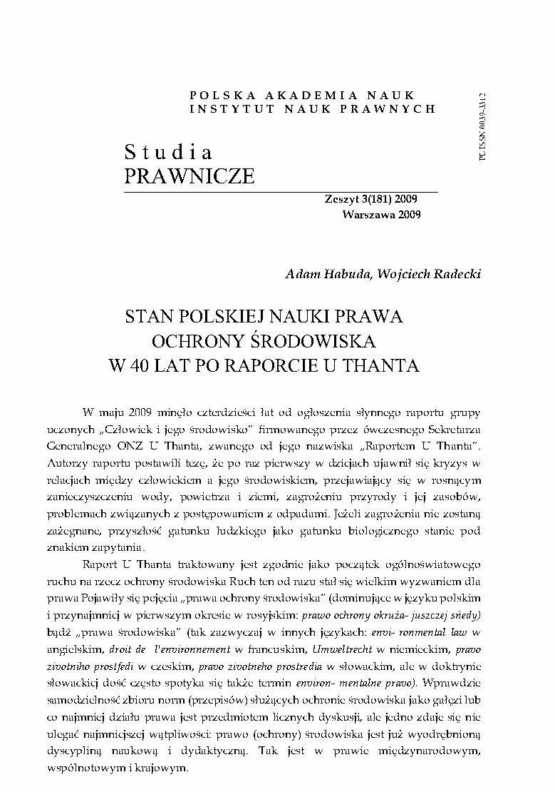 Article is devoted to the state of Polish science of environmental law. In May 2009 had passed 40 years since publication of the famous report of the group of scholars Man and his Environment (known as U Thant’s report), which inspired us to write this article. We try to put diagnosis about the state of science Polish environmental law studying books devoted exclusively to issues of legal protection of the environment, especially those which significantly delimit lines of research. 40 - year period is divided into 6 stages, delimit the boundaries of which are fundamental to environmental protection laws. We emphasize, however, that the study of Polish environmental law did not start from U Thant’s report. It has its origins earlier in the legal protection of nature. Achievements of Polish science of environmental law is significant, and in terms of quantitative and qualitative terms. As the burden of regulation on environmental protection lies with the administrative law, and therefore the vast majority of studies located in administrative law. It does not raise objections Criminal Law to include environmental protection, definitely the worst shows on issues of environmental protection in civil law. Somewhat pessimistic presents a relatively small number of appeals to the doctrine of Polish literature in the international and Community environmental law It should also mention the weakness of comparative studies.