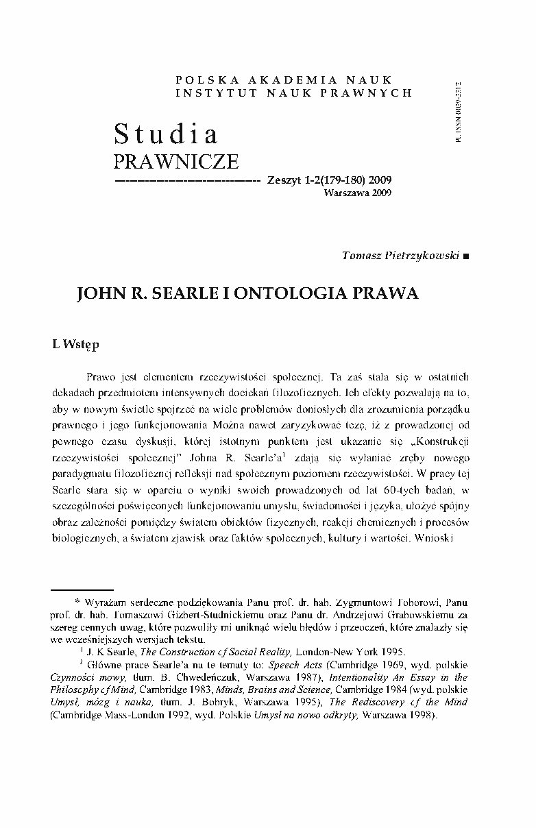 Prawo jest elementem rzeczywistości społecznej. Ta zaś stała się w ostatnich dekadach przedmiotem intensywnych dociekań filozoficznych. Ich efekty pozwalają na to, aby w nowym świetle spojrzeć na wiele problemów doniosłych dla zrozumienia porządku prawnego i jego funkcjonowania Można nawet zaryzykować tezę, iż z prowadzonej od pewnego czasu dyskusji, której istotnym punktem jest ukazanie się „Konstrukcji rzeczywistości społecznej” Johna R. Searle’a zdają się wyłaniać zręby nowego paradygmatu filozoficznej refleksji nad społecznym poziomem rzeczywistości. W pracy tej Searle stara się w oparciu o wyniki swoich prowadzonych od lat 60-tych badań, w szczególności poświęconych funkcjonowaniu umysłu, świadomości i języka, ułożyć spójny obraz zależności pomiędzy światem obiektów fizycznych, reakcji chemicznych i procesów biologicznych, a światem zjawisk oraz faktów społecznych, kultury i wartości.
