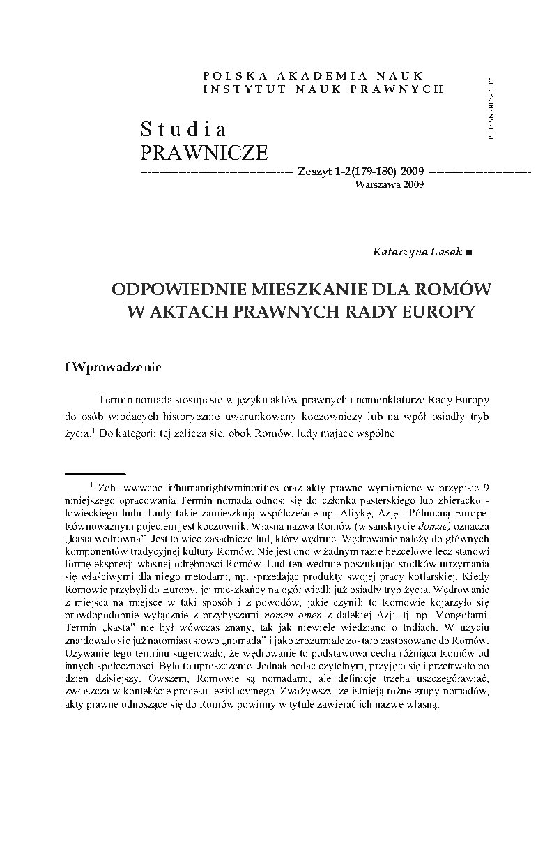 Prawo do mieszkania występuje wyraźnie w Zrewidowanej Karcie Społecznej. W pierwotnej i zmienionej wersji Karta Społeczna gwarantuje szeroko pojmowaną opiekę rodzinie. Opieka ta implikuje pomoc w załatwianiu problemów mieszkaniowych. Konwencja Europejska chroni prywatność mieszkania, życia rodzinnego i korespondencji oraz jego własność. Konwencja o mniejszościach stanowi natomiast o pomocy takim grupom społecznym, jak Romowie we wszechstronnej socjalizacji. Istnieją także uchwały organów Rady Europy bezpośrednio odnoszące się do kwestii zabezpieczenia im mieszkania Wymienione akty prawne stanowią w niniejszym opracowaniu podstawę koncepcji odpowiedniego mieszkania dla Romów w systemie prawnym Rady Europy.