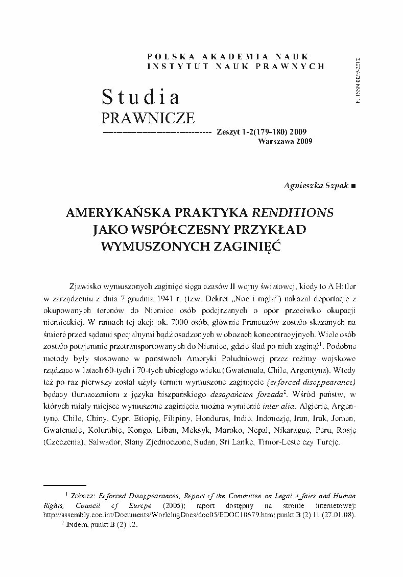 After a short historical introduction of the phenomenon of enforced disappearances, the author analyzes it from the point of view of international human rights law on the one hand and international humanitarian law on the other. Enforced disappearance is one of the most serious violations of human rights, very often described as the infringement of human dignity. Enforced disappearance is not a simple violation but a multiple one which means that it infringes several human rights including many non-derogable (the right to life, freedom from torture and other cruel, inhuman or degrading treatment, the right to recognition everywhere as a person before the law). The characteristic feature of this crime comprises the fact that the victim is devoid of any legal protection and the authorities deny having her or him under control; thus they refuse the victim any rights, in particular a right to a fair trial. The article contains analysis of the following human rights law instruments aimed at protection from enforced disappearances: the UN General Assembly Declaration on the Protection of all Persons from Enforced Disappearance (1992) and the UN Convention for the Protection of all Persons from Enforced Disappearance (2006). It also mentions the Statute of the International Criminal Court (1998) and Inter-American Convention on Forced Disappearance of Persons (1994). The second part-dedicated to international humanitarian law-presents provisions relevant to the protection from enforced disappearances. They are to be found especially in the four Geneva Conventions of 1949 and their Additional Protocols of 1977 which however do not use the term enforced disappearance. Those provisions relate inter alia to the search for and collecting the wounded and sick, recording and forwarding of information, the right of the prisoners of war to send and receive letters and cards, preparation of the wills, death certificates, burial, cremation of the prisoners of war and a Central Prisoners of War Information Agency whose function is to collect all the information it may obtain through official or private channels respecting prisoners of war, and to transmit it as rapidly as possible to the country of origin of the prisoners of war or to the Power on which prisoners depend. Taking this into account the author next explains the contemporary example of enforced disappearances namely American renditions or extraordinary renditions undertaken during the so called “war on terrorism”. Renditions meet all the legal conditions of enforced disappearances which the author tries to prove.