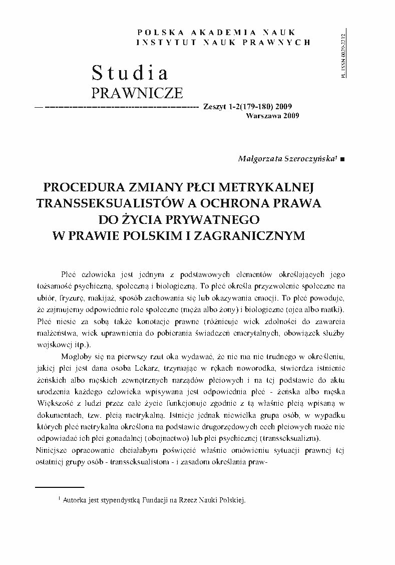 Mogłoby się na pierwszy rzut oka wydawać, że nie ma nic trudnego w określeniu, jakiej płci jest dana osoba Lekarz, trzymając w rękach noworodka, stwierdza istnienie żeńskich albo męskich zewnętrznych narządów płciowych i na tej podstawie do aktu urodzenia każdego człowieka wpisywana jest odpowiednia płeć - żeńska albo męska Większość z ludzi przez całe życie funkcjonuje zgodnie z tą właśnie płcią wpisaną w dokumentach, tzw. płcią metrykalną. Istnieje jednak niewielka grupa osób, w wypadku których płeć metrykalna określona na podstawie drugorzędowych cech płciowych może nie odpowiadać ich płci gonadalnej (obojnactwo) lub płci psychicznej (transseksualizm). Niniejsze opracowanie chciałabym poświęcić właśnie omówieniu sytuacji prawnej tej ostatniej grupy osób - transseksualistom - i zasadom określania prawnego ich płci. U transseksualistów występuje rozbieżność pomiędzy morfologiczno-biologiczną budową ciała, z której wynika określenie płci metrykalnej a psychicznym poczuciem przynależności do płci. Transseksualista czuje odrazę do własnej płci fizycznej i dąży wszelkimi dostępnymi sposobami do posiadania ciała zgodnego z płcią przeżywaną (nawet w formie samokastracji), a co za tym idzie odgrywania roli społecznej i prawnej zgodnej właśnie z tą płcią. Stąd u transseksualistów silna potrzeba doprowadzenia do uznania przez społeczeństwo, że są odmiennej płci, niż ich natura stworzyła.