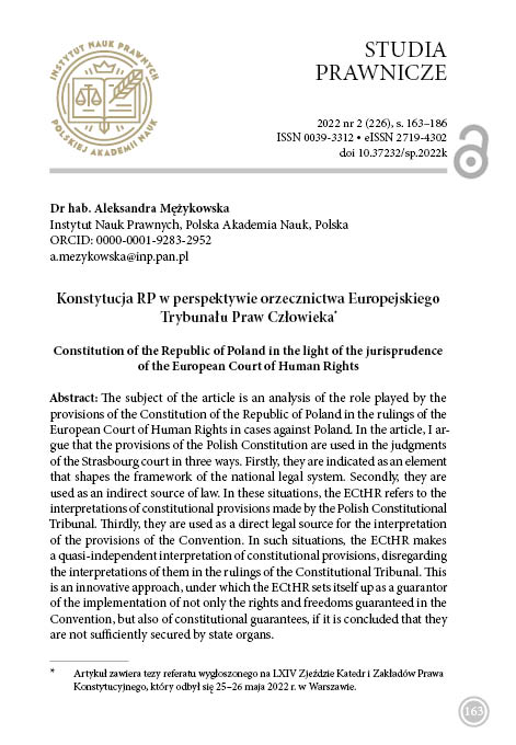 Przedmiotem artykułu jest analiza roli, jaką w orzeczeniach ETPC w sprawach skierowanych przeciwko Polsce odgrywają przepisy Konstytucji RP. W artykule dowodzę, że przepisy Konstytucji RP są wykorzystywane w orzeczeniach trybunału strasburskiego na trzy sposoby. Po pierwsze, są wskazywane jako element kształtujący ramy krajowego systemu prawnego. Po drugie, są wykorzystywane jako pośrednie źródło prawa i w tych sytuacjach ETPC odwołuje się do interpretacji przepisów konstytucyjnych, dokonanej przez TK. Po trzecie, są wykorzystywane jako bezpośrednie źródło prawa do wykładni przepisów EKPC. W takich sytuacjach ETPC nie uwzględnia ich interpretacji dokonanej przez polski TK i dokonuje quasi-samodzielnie (z uwzględnieniem stanowiska innych organów krajowych) interpretuje przepisy konstytucyjne. Jest to podejście nowatorskie, w ramach którego ETPC stawia się w roli gwaranta realizacji nie tylko praw i wolności zagwarantowanych w EKPC, lecz także gwarancji konstytucyjnych, gdy dochodzi do konkluzji, że nie są one zabezpieczone w wystarczającym stopniu przez organy państwa.