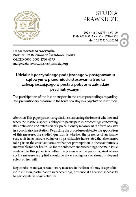 This paper presents regulations concerning the issue of whether and when the insane suspect is obliged to participate in proceedings concerning the application and extension of a precautionary measure in the form of a stay in a psychiatric institution. Regarding the procedure related to the application of this measure, the studied question is whether the presence of an insane suspect is in fact always obligatory if psychiatrists have stated that she cannot take part in the court activities or that her participation in these activities is inadvisable for her health. As for the enforcement proceedings, the main issue analyzed in this paper is whether the presence of the person against whom such a measure is applied should be always obligatory or should it depend solely on her will.