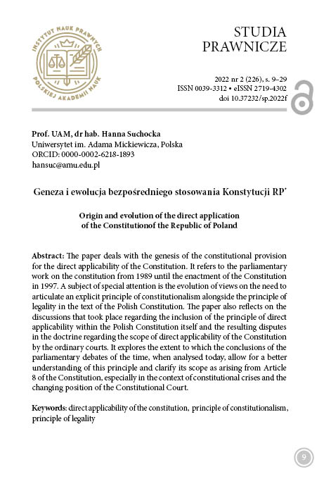 The paper deals with the problem of the genesis of the constitutional provision of the principle of direct applicability of the Constitution. It refers to the parliamentary constitution-making works from 1989 until enactment of the Constitution in 1997. The subject of special attention is the evolution of views on the need of the articulation of an explicit principle of constitutionalism alongside the principle of legality in the text of the Polish Constitution. It also reflects on the discussions that took place around the inclusion of the principle of direct applicability of the constitution in the Polish Constitution and the resulting disputes in the doctrine regarding the scope of direct applicability of the Constitution by the ordinary courts. To what extent the conclusions of the parliamentary debates of the time, analysed today, allow for a better understanding of this principle and a clarification of its scope arising from Article 8 of the Constitution, especially in the context of constitutional crises and the changing position of the Constitutional Court.