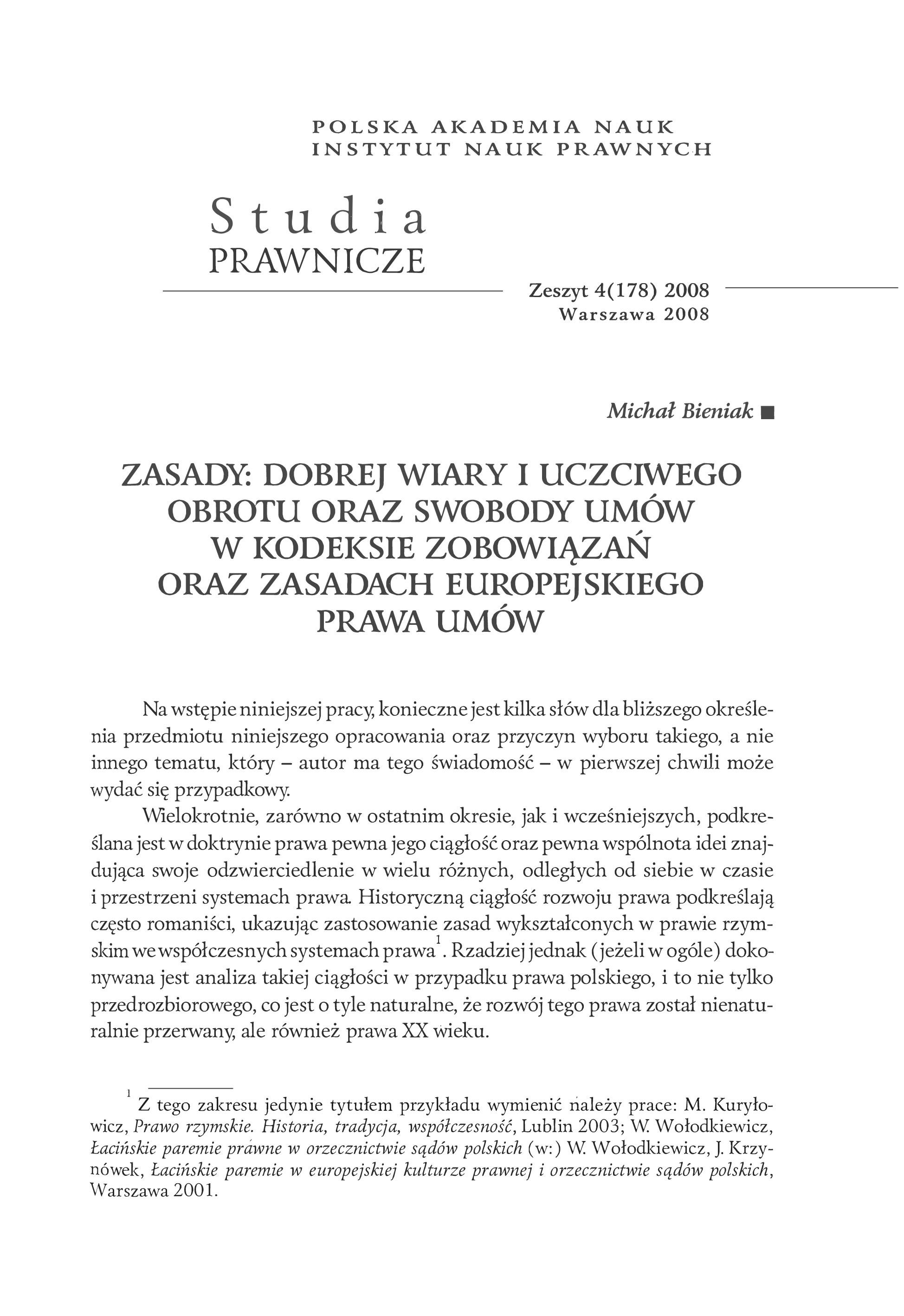 The publication is devoted to the two of key principles in modern civil law studies: principle of good faith and fair dealing as well as the principle of freedom of contract. The presentation of those principles in light of two acts of law that vary in nature and time of creation allows for demonstrating how permanent they are and how essential to the civil law of the countries with free market economy The two discussed principles have been present both in the code of obliga tions and in the Principles of European Contract Law (PECL). Their role in both acts was important and similar, though the code of obligations attached relatively smallest importance to the fair dealing principles clause. As concerns the principle of freedom of contract, the PECL have repeated the solution, the forerunners of which were, among others, the authors of the code of obligations, namely the regulation of the principles of freedom of con tract with a positive approach. The principles of good faith (in case of the PECL-also the principles of fair dealing) are visible, both under the code of obligations and the PECL, in the entire duration of the obligation relationship between the parties, starting from the moment when the parties express their intentions to the interpretation of the statements of intent (contracts) to the performance of obligations (contrac tual obligations). The conducted analysis of the code of obligations and the PECL allowed the author to bring up several theses of vital importance to the idea of trans national unification of private law and for the history of Polish law, which can be summed up in form of the following conclusions: 1. the principles lying at the foundations of the PECL have been present in the Polish law for at least several dozen years; 2. the principles of freedom of contract as well as good faith and fair deal ing, particularly important to the modern civil law studies, have played an important role in the Polish pre-war legislation as well; 3. certain solutions, relatively innovative at the time when the code of obli gations was adopted, subsequently found their regular place in the Eu ropean civil law.