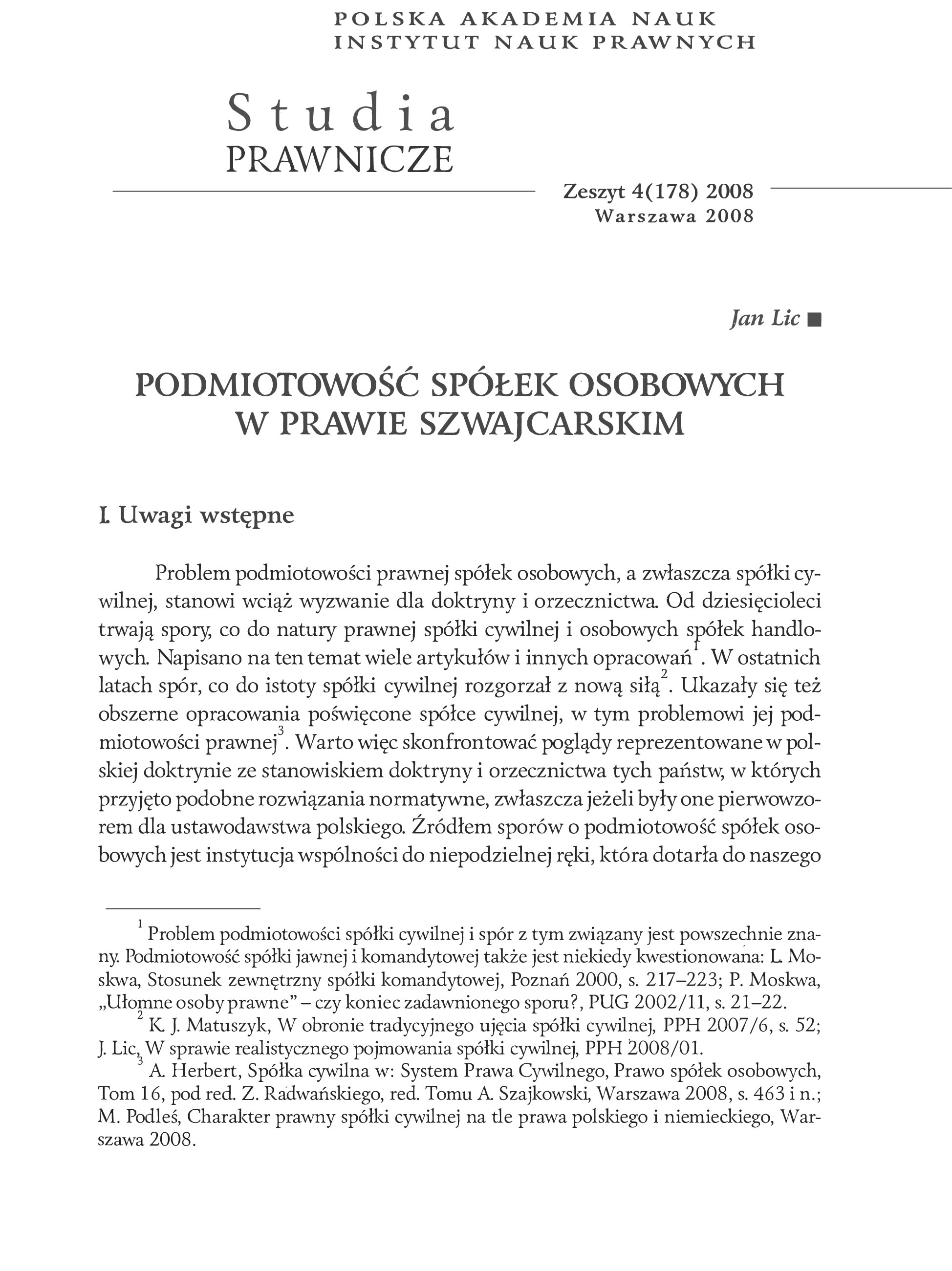 - Lic J., W sprawie realistycznego pojmowania spółki cywilnej, „Przegląd Prawa Handlowego” 2008, nr 1.