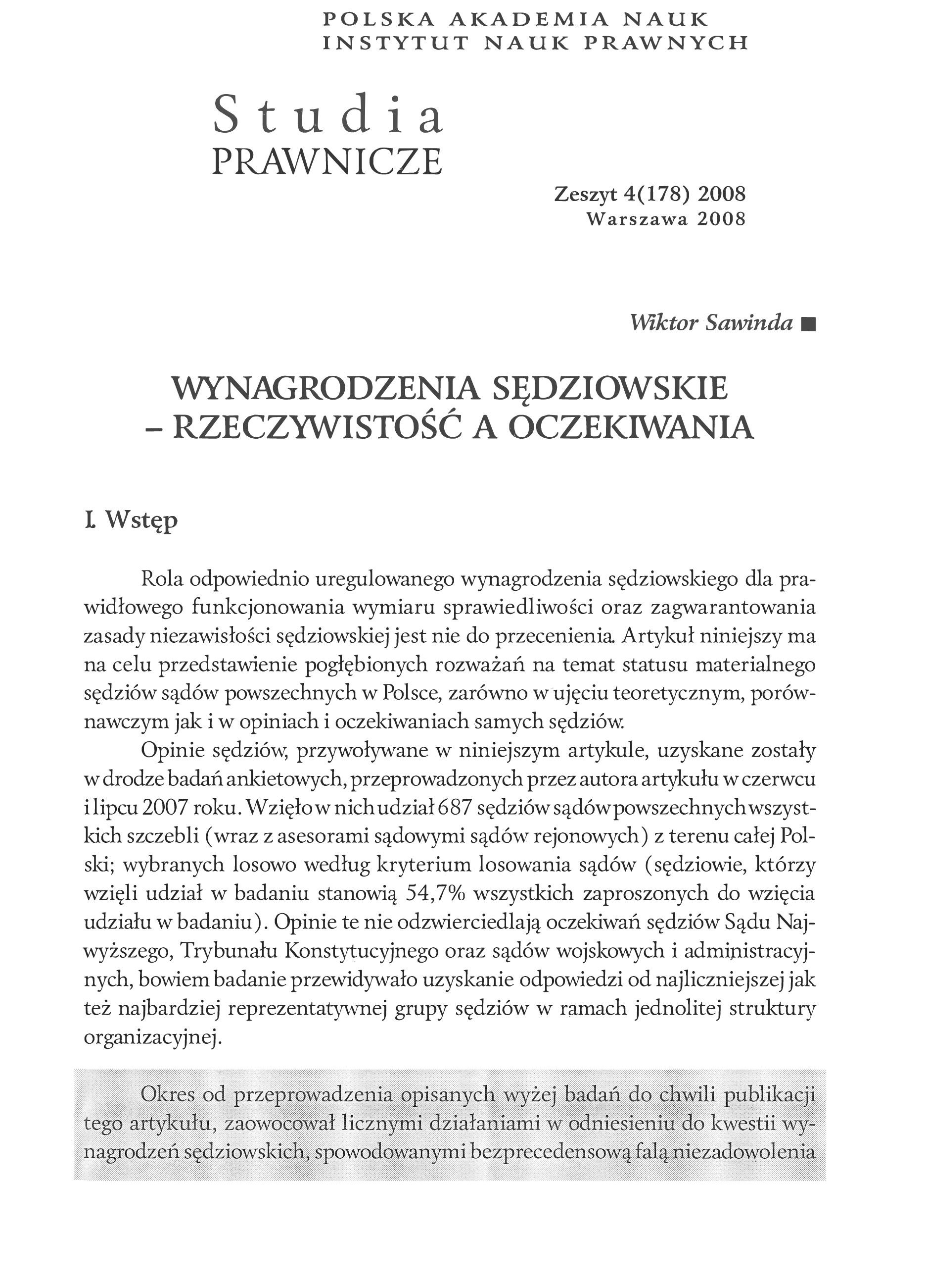 A proper and adequate judicial remuneration is one of the basic safeguards of an independent and strong judiciary. The article aims to present an endeepe ned view on Polish judicial remunerations, and includes an analysis of law, juri sprudence, social reality and opinions of judges themselves. The basis for the ana lysis of judicial expectations in relations to remunerations, was a wide-range su rvey among 687 judges of Polish common courts (i.e. regional, circuit and appeal courts), conducted on June 2007. Poland as one of post-communist countries after 20 years of transformation, is continuously developing its democratic insti tutions and improving safeguards of the rule of law. Although the way towards the western democracies is already impressive and in many ways successful, a number of important issues have not been solved in a satisfactory way: One of them is the position of Polish judges among other state powers and the econo mical position of judges in comparison with judges of other EU Member States. This raises serious concerns and calls for changes. According to research conduc ted by the Council of Europe in 2006, Polish judges are almost at the very end of European statistics, when it comes to comparison of their salaries. That causes serious implications to proper conduct of their duties, as well as to their indepen dence and the whole rule of law. A survey conducted among judges, and presented in this article, proves that the level of dissatisfaction raises a number of problems (e.g. strong willingness of migration to better paid legal professions). Moreover it indicates dangerous points in the legal system (e.g. unjust disproportions in re munerations, lack of balance between the executive and judicial power) that re quire immediate change. The article is a comprehensive and analytic insight in the finances-related problems of Polish judiciary.