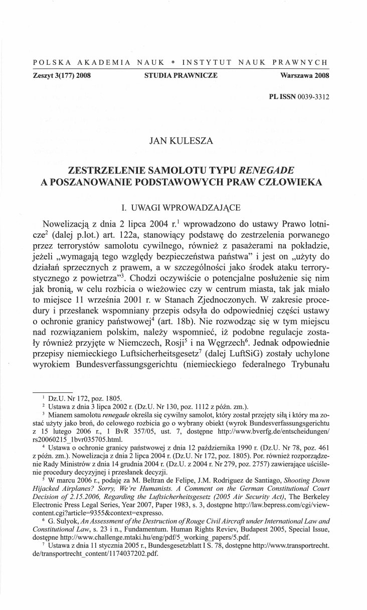 Nowelizacją z dnia 2 lipca 2004 r. wprowadzono do ustawy Prawo lotnicze (dalej p.lot.) art. 122a, stanowiący podstawę do zestrzelenia porwanego przez terrorystów samolotu cywilnego, również z pasażerami na pokładzie, jeżeli „wymagają tego względy bezpieczeństwa państwa” i jest on „użyty do działań sprzecznych z prawem, a w szczególności jako środek ataku terrorystycznego z powietrza”. Chodzi oczywiście o potencjalne posłużenie się nim jak bronią, w celu rozbicia o wieżowiec czy w centrum miasta, tak jak miało to miejsce 11 września 2001 r. w Stanach Zjednoczonych. W zakresie procedury i przesłanek wspomniany przepis odsyła do odpowiedniej części ustawy o ochronie granicy państwowej4(art. 18b). Nie rozwodząc się w tym miejscu nad rozwiązaniem polskim, należy wspomnieć, iż podobne regulacje zostały również przyjęte w Niemczech, Rosji i na Węgrzech. Jednak odpowiednie przepisy niemieckiego Luftsicherheitsgesetz (dalej LuftSiG) zostały uchylone wyrokiem Bundesverfassungsgerichtu (niemieckiego federalnego Trybunału Konstytucyjnego, dalej BVerfG) z dnia 15 lutego 2006 r., m.in. ze względu na sprzeczność takiego rozwiązania z podstawowymi prawami człowieka. Przyjęcie polskich przepisów przeszło niemal całkowicie niezauważone zarówno przez opinię publiczną, jak i prawników. Wydają się one przy tym niezwykle podobne do uchylonych przez Bundesverfassungsgericht, argumenty zaś przytoczone przez Trybunał zdają się mieć walor uniwersalny. Celowe wydaje się zatem prześledzenie losów niemieckiej ustawy oraz następnie odpowiedź na pytanie, czy również odpowiednie regulacje polskich ustaw pozostają w sprzeczności z konstytucyjnie chronionymi wartościami.