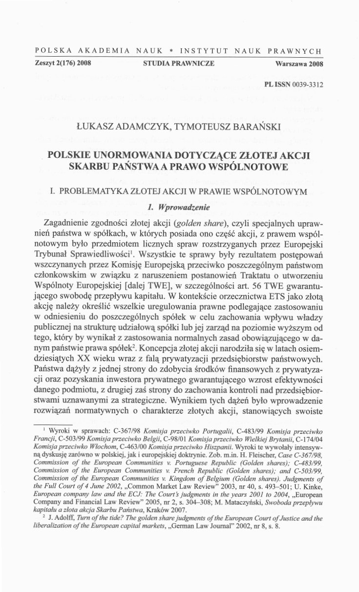 - Adolff J., Tum of the tide? The golden share judgments of the European Court of Justice and the liberalization of the European Capital markets, „German Law Journal” 2002, nr 8.
