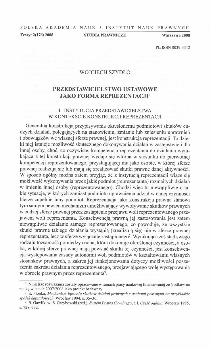 The subject of the presented deliberations is the legal construction giving the possibility to attribute a given subject with effects of other entities' actions which actions consist of enactment, change, or abolishing of entitlements or obligations within own legal sphere-referred to as representation. Owing to such entitlement, the representative can act effectively on behalf of another person, even though, what is obvious, his competences arising from this legal construc tion seem to be secondary o the primary competence of repr is entitled to the representation, which he of given activities are realized or a person in whose legal sphere legal effects of given for are to be realized. Generally, one can assume that the institution of recents of representation is associated with the possibility to perform by a given subject a subject (the representative) various acts on behalf of another person (the represented). Representation as a legal construction constitutes, therefore, a mechanism, which makes it possible to cause legal effects in other entity's legal sphere by substitu tion of the to f the represented manifestation of will with the manifestation of will of the representative. Legal consequences of its execution are, therefore, acts of the represented subject, and as a result all legal consequences of such acts will take place only in the legal sphere of the all le the represented. In order to cause legal effects via other persons, the subject of the legal sphere has at his disposal - within the structure of representation - certain legal instru ments, among which the most important is the institution of representation. The is legislator expresses this issue clearly. One may quote in this point Article 95(1) of the Civil Code, which allows-of course with stipulations specified by law arising from the nature of the legal act-to execute legal actions via a representa or tive. What it means is that, if a given person (representative) signs a declaration of will on behalf of another person (the represented) and at the same time executes a legal action which, as long as it is within the representative's rights of acting on of the represented (authorisation), causes legal effects not for himself, but behalf of directly for the person represented by him. in the Polish legal system the source of competences authorising the represen In the tative to act can be either the will of the legislator or the will of the represented. Therefore, among the designata of the structure of representation, and according to Article 96 of the Civil Code, we can distinguish between statutory representation and proxy. Whenever the authorisation to act on behalf of the represented comes from his will, we are dealing with proxy. On the other hand, when the authorisa tion to execute legal actions on behalf of the represented arises as consequence of realization of an actual state, specified by provisions of law or a decision based on the provisions issued by court, or any administrative body therefore result ing from certain legal situations and independent of his will, we are dealing with statutory representation. Hence, we can assume that statutory representation has one common feature: the source of authorisation for the statutory representative is not a declaration of will of the represented. Differently, then, to proxy, statu tory representation is, in principle, imposed by law, because the will of the person for whom the representative shall be appointed has no influence on his choice, appointment or the scope of his authorisation (further functioning). A statutory representative is bound with a provision of law to represent a person, for whom he was appointed, which results in the situation, where any activities performed by him, regardless of the lack of will of the represented to act on his behalf, are executed on behalf f the represented person and with direct effect for this person enheme. The within her legal sphere. This means that appointing a representative of this kind should always take place according to the t e piace securing t interests. e represented person's intere Basing on the present specific legal regulations, a wide group of subjects can Call be recognized statutory representatives. First of all we must point out, that a clas sic example are parents, having their parental authorities over minors (see Art. 98 of Family and Guardianship Code); carers who are obliged to take care of a minor (see Art. 155 (2) of FGC), or of a totally incapacitated who does not stay under parental authority (see Art. 13 (2) of the Civil Code); guardians appointed for the partially incapacitated (see Art. 16 (2) of the CC); temporary advisers ap pointed during the proceedings for incapacitation (see Art. 549 (2) of the Code of Civil Procedure); as well as heads of government offices, within the r meaning of provisions on employees of government offices, especially general directors of offices who who, basing on the provisions of Art 17 (1) of the Act of August, 8 1996 on the execution of State Treasury amended), who represent the State Competencies (Dz. U. No 106, item 493, as Treasury with reference to property they were entrusted with, as well as in the scope of the tasks of their offices, as specified by separate provisions- therefore they have statutory authorisation to represent the State Treasury. Additionally, within the statutory representation one can distin guish institutional representation - i.e. representation by a legally created organi sational body, which, as a whole is authorised to represent a given subject of civil law, within whose legal subjectivity he is operating acting outside on his behalf, and representation by an administrative body. The two above forms should be considered individual kinds of statutory representation. The presented examples of statutory representation, broadly analysed in this publication, show, that in the Polish legal system there are many subjects which, for va