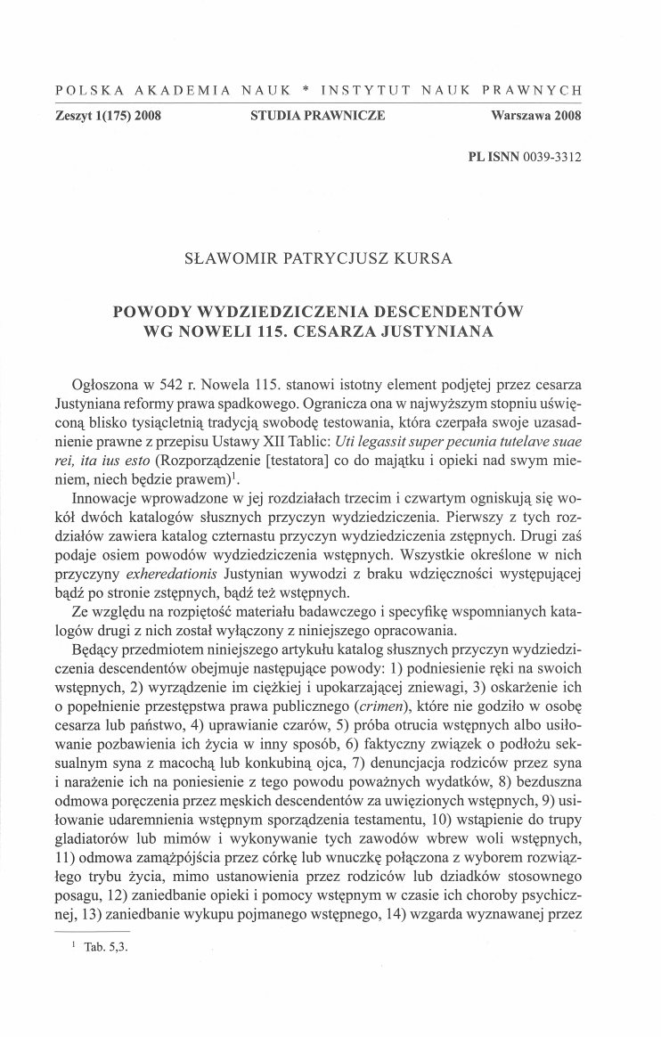 The Novel 115th, announced in 542, is a substantial element of the inheritance law reform undertaken by emperor Justinian. It introduces the highest limitations to an almost one-thousand-year-honored tradition of the freedom of testing that was legally based on the regulation of the Twelve Tables, Tab. 5,3: Uti legassit super pecunia tutelave suae rei, ita ius esto. Innovations introduced in its third and fourth chapters focus on two catalogs of justified reasons for disinheriting. The former chapter contains a catalog of fourteen reasons for disinheriting descendants. The latter one gives eight reasons for disin heriting ancestors. Justinian derives all specified reasons for exheredationis from the lack of gratitude from either descendants or ancestors. The present article is a review of the catalog of the following justified reasons for disinheriting descendants: 1) raising one's hand to strike their ancestors; 2) caus ing a serious or humiliating insult at them; 3) accusing them of having committed a public law crime (crimen) that did not harm the emperor or the state; 4) using magic; 5) making an attempt to poison or kill ancestors in another way; 6) a real relation ship of a sexual nature between a son and his stepmother or his father's concubine; 7) a denunciation of parents by their son and because of that putting them at risk of incurring serious costs; 8) a soulless refusal of male descendants to guarantee their arrested ancestors; 9) making an attempt to frustrate their ancestors' intentions to make a will; 10) joining a troupe of gladiators or mummers and doing these jobs against the ancestors' will; 11) a daughter's or granddaughter's refusal to get mar ried connected with the choice of dissolute lifestyle despite the fact that parents or grandparents dowered her appropriately; 12) neglecting ancestor-care and assistance during their mental illness; 13) neglecting to pay ransom for their captured ancestors; 14) contempt for the ancestor's catholic beliefs by practicing heresy and not main taining contacts with the Church. The analysis that was carried out shows that in the perspective of principium and paragraph 15 of Nov. 115,3 an ancestor could have disinherited a descendant only if one of the following two conditions had been fulfilled: 1) if he had given his descend ant a statutory inheritance in the form of a deed of gift, legacy, fideicommissum or in any other way; 2) if he had stated in his will at least one of the fourteen reasons for his descendant's ingratitude specified by Justinian in Nov. 115, 3. Some of them were known in the Roman law earlier although they needed further clarification, others were added to the said catalog by Justinian as they deserved it because of various reasons. Most of them referred to all the descendants. Because of the sixth or the seventh reason, the testator could disinherit only his son; because of the eighth one - every male descendant; because of the eleventh one-only a daughter or granddaughter. The character of some reasons for disinheriting limited the range of subjects who could use it; it took place in the case of the sixth one (father), the seventh one (par ents) and the eleventh one (parents and grandparents). Defining the ninth, twelfth, thirteenth and fourteenth reasons of descendants ingratitude, Justinian elaborated on the thread of descendants' unworthiness because of these reasons. This way he emphasized that in case of the existence of one of them. if a descendant had not been disinherited, he would have deserved being deprived of the inheritance. Making comments on the twelfth, thirteenth and fourteenth reasons of ingratitude, he also indicated who is to inherit instead of an unworthy descendant None of the reasons of ingratitude mentioned in the catalog, no matter how jus tifiable reason for disinheriting it would be, did not oblige a testator to disinherit an ungrateful descendant.