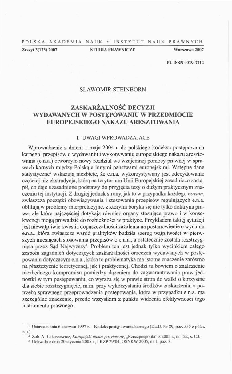 Wprowadzenie z dniem 1 maja 2004 r. do polskiego kodeksu postępowania karnego przepisów o wydawaniu i wykonywaniu europejskiego nakazu aresztowania (e.n.a.) otworzyło nowy rozdział we wzajemnej pomocy prawnej w sprawach karnych między Polską a innymi państwami europejskimi. Wstępne dane statystyczne wskazują niezbicie, że e.n.a. wykorzystywany jest zdecydowanie częściej niż ekstradycja, którą na terytorium Unii Europejskiej zasadniczo zastąpił, co daje uzasadnione podstawy do przyjęcia tezy o dużym praktycznym znaczeniu tej instytucji. Z drugiej jednak strony, jak to w przypadku każdego novum, zwłaszcza początki obowiązywania i stosowania przepisów regulujących e.n.a. obfitują w problemy interpretacyjne, z którymi boryka się nie tylko doktryna prawa, ale które najczęściej dotykają również organy stosujące prawo i w konsekwencji mogą prowadzić do rozbieżności w praktyce. Przykładem takiej sytuacji jest niewątpliwie kwestia dopuszczalności zażalenia na postanowienie o wydaniu e.n.a., która zwłaszcza wśród praktyków budziła szereg wątpliwości w pierwszych miesiącach stosowania przepisów o e.n.a., a ostatecznie została rozstrzygnięta przez Sąd Najwyższy. Problem ten jest jednak tylko wycinkiem całego zespołu zagadnień dotyczących zaskarżalności orzeczeń wydawanych w postępowaniu dotyczącym e.n.a., która to problematyka ma istotne znaczenie zarówno na płaszczyźnie teoretycznej, jak i praktycznej. Chodzi tu bowiem o znalezienie niezbędnego kompromisu pomiędzy dążeniem do zagwarantowania praw jednostki w tym postępowaniu, co wyraża się w prawie stron do walki o korzystne dla siebie rozstrzygnięcie, m.in. przy wykorzystaniu środków zaskarżenia, a potrzebą sprawnego przeprowadzenia postępowania, która w przypadku e.n.a. ma szczególne znaczenie, przede wszystkim z punktu widzenia efektywności tego instrumentu prawnego.