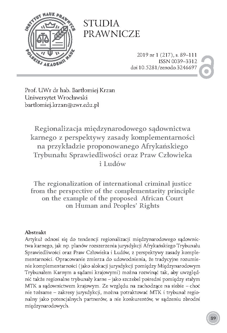 Artykuł odnosi się do tendencji regionalizacji międzynarodowego sądownictwa karnego, jak np. planów rozszerzenia jurysdykcji Afrykańskiego Trybunału Sprawiedliwości oraz Praw Człowieka i Ludów, z perspektywy zasady komplementarności. Opracowanie zmierza do udowodnienia, że tradycyjne rozumienie komplementarności (jako alokacji jurysdykcji pomiędzy Międzynarodowym Trybunałem Karnym a sądami krajowymi) można rozwinąć tak, aby uwzględnić także regionalne trybunały karne – jako szczebel pośredni pomiędzy stałym MTK a sądownictwem krajowym. Ze względu na zachodzące na siebie – choć nie tożsame – zakresy jurysdykcji, można potraktować MTK i trybunał regionalny jako potencjalnych partnerów, a nie konkurentów, w sądzeniu zbrodni międzynarodowych.