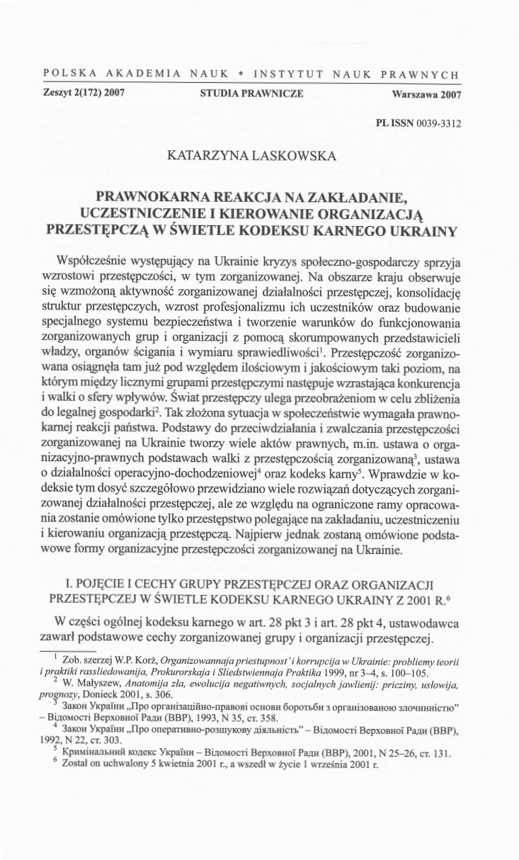 Współcześnie występujący na Ukrainie kryzys społeczno-gospodarczy sprzyjawzrostowi przestępczości, w tym zorganizowanej. Na obszarze kraju obserwuje się wzmożoną aktywność zorganizowanej działalności przestępczej, konsolidację struktur przestępczych, wzrost profesjonalizmu ich uczestników oraz budowanie specjalnego systemu bezpieczeństwa i tworzenie warunków do funkcjonowania zorganizowanych grup i organizacji z pomocą skorumpowanych przedstawicieli władzy, organów ścigania i wymiaru sprawiedliwości. Przestępczość zorganizowana osiągnęła tam już pod względem ilościowym i jakościowym taki poziom, na którym między licznymi grupami przestępczymi następuje wzrastająca konkurencja i walki o sfery wpływów. Świat przestępczy ulega przeobrażeniom w celu zbliżenia do legalnej gospodarki.Tak złożona sytuacja w społeczeństwie wymagała prawnokarnej reakcji państwa. Podstawy do przeciwdziałania i zwalczania przestępczości zorganizowanej na Ukrainie tworzy wiele aktów prawnych, m.in. ustawa o organizacyjno-prawnych podstawach walki z przestępczością zorganizowaną, ustawa o działalności operacyjno-dochodzeniowej oraz kodeks kamy. Wprawdzie w kodeksie tym dosyć szczegółowo przewidziano wiele rozwiązań dotyczących zorganizowanej działalności przestępczej, ale ze względu na ograniczone ramy opracowania zostanie omówione tylko przestępstwo polegające na zakładaniu, uczestniczeniu i kierowaniu organizacją przestępczą. Najpierw jednak zostaną omówione podstawowe formy organizacyjne przestępczości zorganizowanej na Ukrainie.