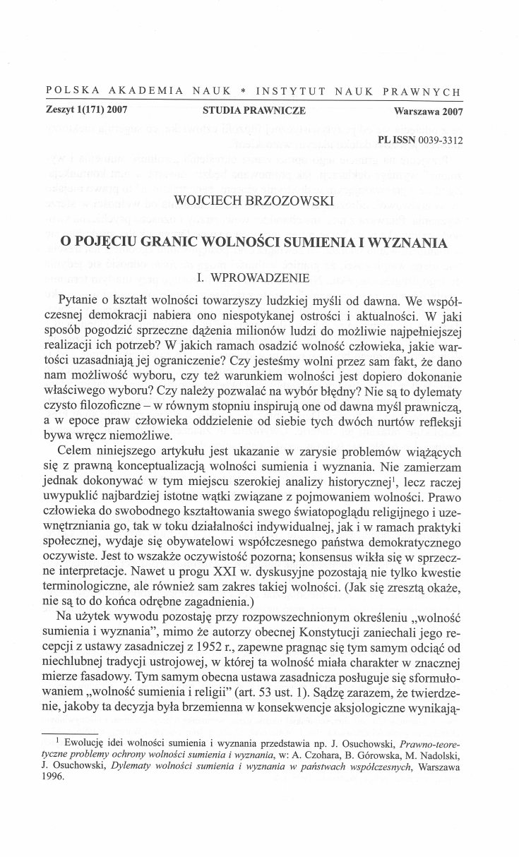 Celem niniejszego artykułu jest ukazanie w zarysie problemów wiążących się z prawną konceptualizacją wolności sumienia i wyznania. Nie zamierzam jednak dokonywać w tym miejscu szerokiej analizy historycznej1, lecz raczej uwypuklić najbardziej istotne wątki związane z pojmowaniem wolności. Prawo człowieka do swobodnego kształtowania swego światopoglądu religijnego i uzewnętrzniania go, tak w toku działalności indywidualnej, jak i w ramach praktyki społecznej, wydaje się obywatelowi współczesnego państwa demokratycznego oczywiste. Jest to wszakże oczywistość pozorna; konsensus wikła się w sprzeczne interpretacje. Nawet u progu XXI w. dyskusyjne pozostają nie tylko kwestie terminologiczne, ale również sam zakres takiej wolności. (Jak się zresztą okaże, nie są to do końca odrębne zagadnienia.)