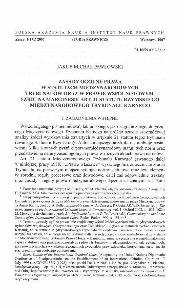 Wśród bogatego piśmiennictwa, tak polskiego, jak i zagranicznego, dotyczącego Międzynarodowego Trybunału Karnego na próżno szukać szczegółowej analizy źródeł wyrokowania zawartych w artykule 21 statutu tegoż trybunału (zwanego Statutem Rzymskim). Autor niniejszego artykułu ma ambicję postawienia kilku istotnych pytań o prawnomiędzynarodowy status tych norm oraz przedstawienia natury zasad ogólnych prawa w różnych aktach prawa narodów.