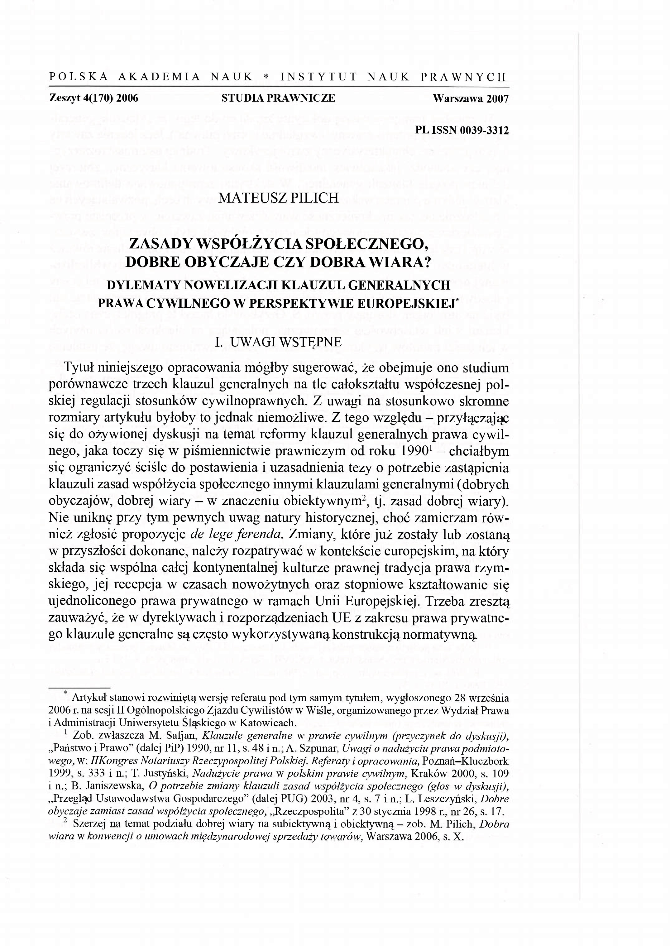 Tytuł niniejszego opracowania mógłby sugerować, że obejmuje ono studium porównawcze trzech klauzul generalnych na tle całokształtu współczesnej polskiej regulacji stosunków cywilnoprawnych. Z uwagi na stosunkowo skromne rozmiary artykułu byłoby to jednak niemożliwe. Z tego względu - przyłączając się do ożywionej dyskusji na temat reformy klauzul generalnych prawa cywilnego, jaka toczy się w piśmiennictwie prawniczym od roku 1990 - chciałbym się ograniczyć ściśle do postawienia i uzasadnienia tezy o potrzebie zastąpienia klauzuli zasad współżycia społecznego innymi klauzulami generalnymi (dobrych obyczajów, dobrej wiary - w znaczeniu obiektywnym, tj. zasad dobrej wiary). Nie uniknę przy tym pewnych uwag natury historycznej, choć zamierzam również zgłosić propozycje de lege ferenda. Zmiany, które już zostały lub zostaną w przyszłości dokonane, należy rozpatrywać w kontekście europejskim, na który składa się wspólna całej kontynentalnej kulturze prawnej tradycja prawa rzymskiego, jej recepcja w czasach nowożytnych oraz stopniowe kształtowanie się ujednoliconego prawa prywatnego w ramach Unii Europejskiej. Trzeba zresztą zauważyć, że w dyrektywach i rozporządzeniach UE z zakresu prawa prywatnego klauzule generalne są często wykorzystywaną konstrukcją normatywną.