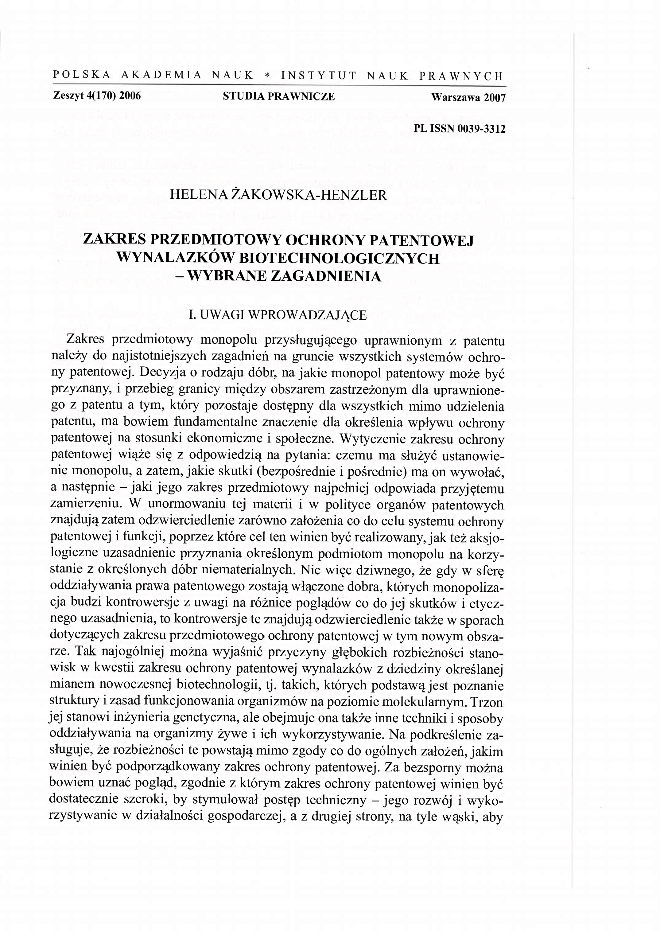 Zakres przedmiotowy monopolu przysługującego uprawnionym z patentu należy do najistotniejszych zagadnień na gruncie wszystkich systemów ochrony patentowej. Decyzja o rodzaju dóbr, na jakie monopol patentowy może być przyznany, i przebieg granicy między obszarem zastrzeżonym dla uprawnionego z patentu a tym, który pozostaje dostępny dla wszystkich mimo udzielenia patentu, ma bowiem fundamentalne znaczenie dla określenia wpływu ochrony patentowej na stosunki ekonomiczne i społeczne. Wytyczenie zakresu ochrony patentowej wiąże się z odpowiedzią na pytania: czemu ma służyć ustanowienie monopolu, a zatem, jakie skutki (bezpośrednie i pośrednie) ma on wywołać, a następnie - jaki jego zakres przedmiotowy najpełniej odpowiada przyjętemu zamierzeniu. W unormowaniu tej materii i w polityce organów patentowych znajdują zatem odzwierciedlenie zarówno założenia co do celu systemu ochrony patentowej i funkcji, poprzez które cel ten winien być realizowany, jak też aksjologiczne uzasadnienie przyznania określonym podmiotom monopolu na korzystanie z określonych dóbr niematerialnych. Nic więc dziwnego, że gdy w sferę oddziaływania prawa patentowego zostają włączone dobra, których monopolizacja budzi kontrowersje z uwagi na różnice poglądów co do jej skutków i etycznego uzasadnienia, to kontrowersje te znajdują odzwierciedlenie także w sporach dotyczących zakresu przedmiotowego ochrony patentowej w tym nowym obszarze. Tak najogólniej można wyjaśnić przyczyny głębokich rozbieżności stanowisk w kwestii zakresu ochrony patentowej wynalazków z dziedziny określanej mianem nowoczesnej biotechnologii, tj. takich, których podstawą jest poznanie struktury i zasad funkcjonowania organizmów na poziomie molekularnym.