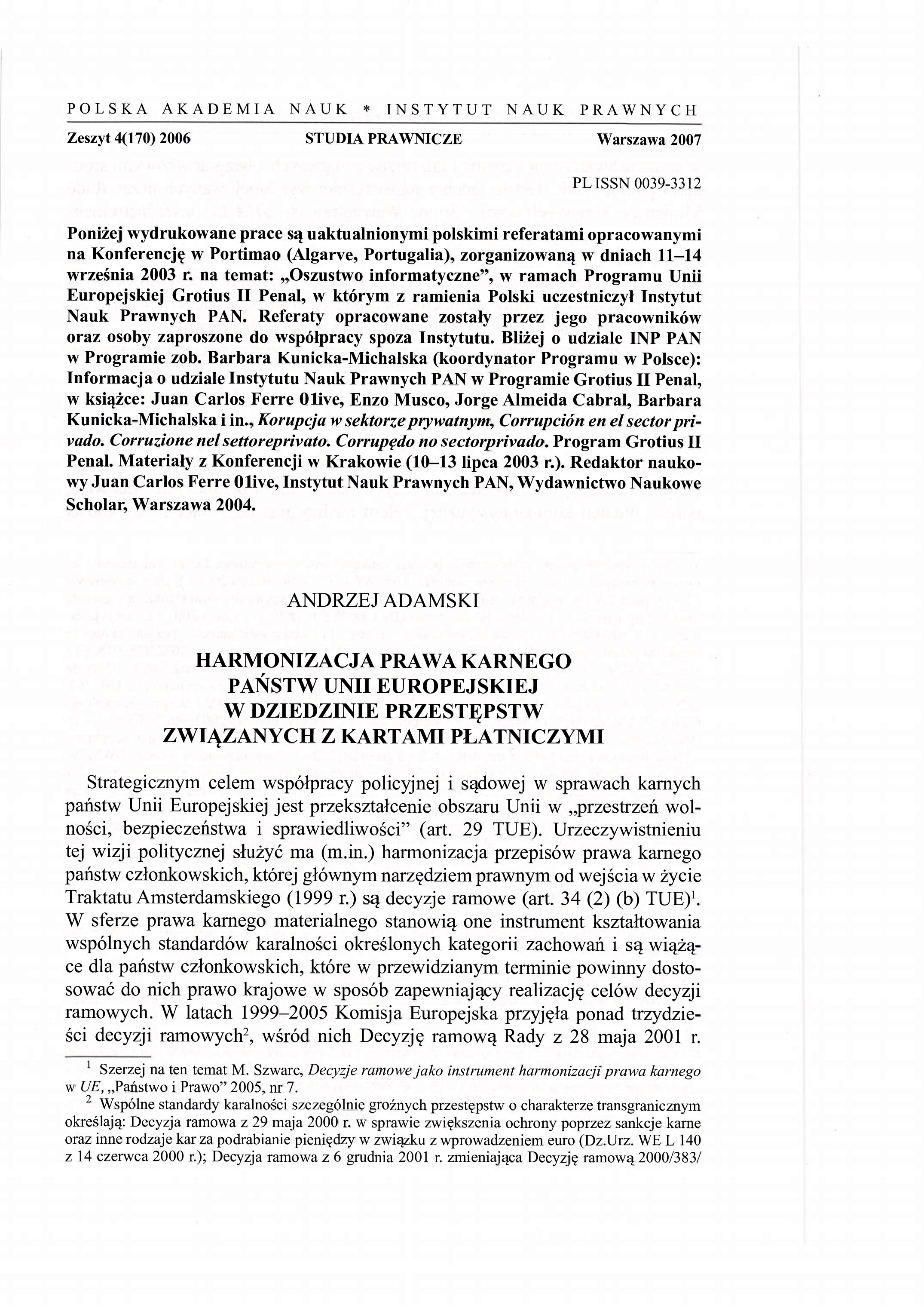 Strategicznym celem współpracy policyjnej i sądowej w sprawach karnych państw Unii Europejskiej jest przekształcenie obszaru Unii w „przestrzeń wolności, bezpieczeństwa i sprawiedliwości” (art. 29 TUE). Urzeczywistnieniu tej wizji politycznej służyć ma (m.in.) harmonizacja przepisów prawa karnego państw członkowskich, której głównym narzędziem prawnym od wejścia w życie Traktatu Amsterdamskiego (1999 r.) są decyzje ramowe (art. 34 (2) (b) TUE). W sferze prawa karnego materialnego stanowią one instrument kształtowania wspólnych standardów karalności określonych kategorii zachowań i są wiążące dla państw członkowskich, które w przewidzianym terminie powinny dostosować do nich prawo krajowe w sposób zapewniający realizację celów decyzji ramowych. W latach 1999-2005 Komisja Europejska przyjęła ponad trzydzieści decyzji ramowych, wśród nich Decyzję ramową Rady z 28 maja 2001 r. w sprawie zwalczania oszustw i fałszerstw związanych z bezgotówkowymi środkami płatniczymi. Jest to jeden z najwcześniej wynegocjowanych przez Radę Ministrów Sprawiedliwości i Spraw Wewnętrznych (JHA Council) instrumentów harmonizacji prawa karnego państw członkowskich UE, który ma zapewnić lepszą współpracę organów ścigania i wymiaru sprawiedliwości państw członkowskich w dziedzinie zwalczania przestępczości związanej z bezgotówkowym obrotem pieniężnym oraz wzmocnić ochronę prawną posiadaczy i wydawców kart płatniczych na obszarze Unii Europejskiej przed nadużyciami.