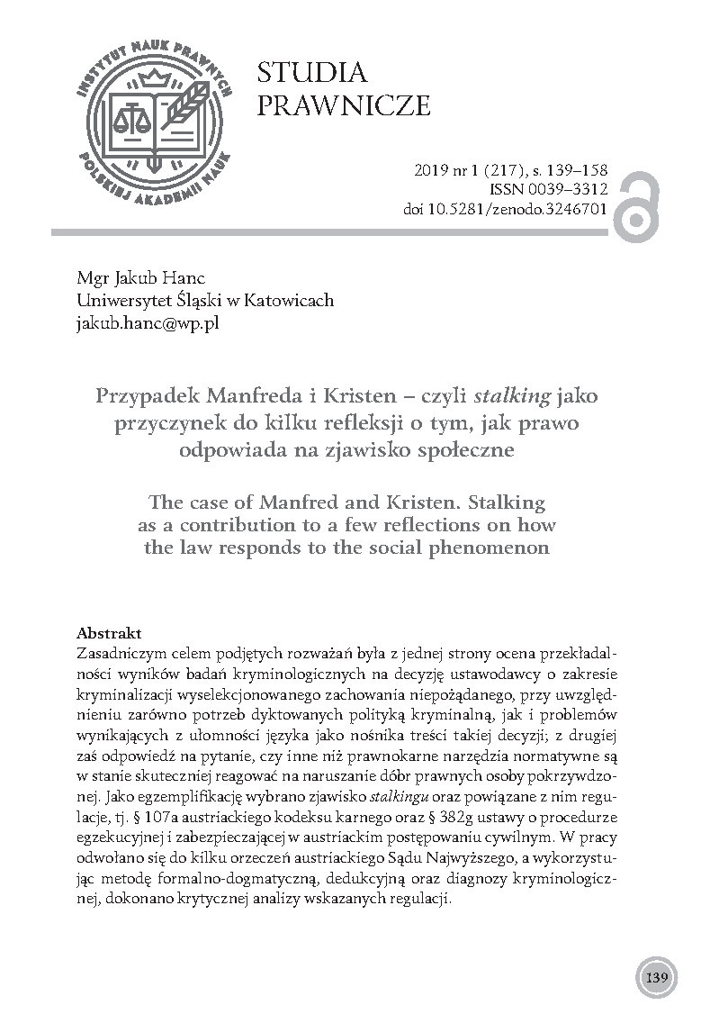 Zasadniczym celem podjętych rozważań była z jednej strony ocena przekładalności wyników badań kryminologicznych na decyzję ustawodawcy o zakresie kryminalizacji wyselekcjonowanego zachowania niepożądanego, przy uwzględnieniu zarówno potrzeb dyktowanych polityką kryminalną, jak i problemów wynikających z ułomności języka jako nośnika treści takiej decyzji; z drugiej zaś odpowiedź na pytanie, czy inne niż prawnokarne narzędzia normatywne są w stanie skuteczniej reagować na naruszanie dóbr prawnych osoby pokrzywdzonej. Jako egzemplifikację wybrano zjawisko stalkingu oraz powiązane z nim regulacje, tj. § 107a austriackiego kodeksu karnego oraz § 382g ustawy o procedurze egzekucyjnej i zabezpieczającej w austriackim postępowaniu cywilnym. W pracy odwołano się do kilku orzeczeń austriackiego Sądu Najwyższego, a wykorzystując metodę formalno-dogmatyczną, dedukcyjną oraz diagnozy kryminologicznej, dokonano krytycznej analizy wskazanych regulacji.