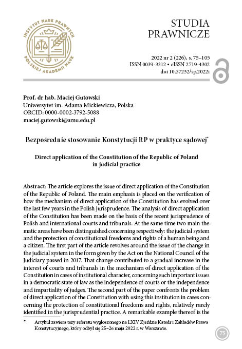 The article explores the issue of direct application of the Constitution of the Republic of Poland. The main emphasis is placed on the verification of how the mechanism of direct application of the Constitution has evolved over the last few years in the Polish jurisprudence. The analysis of direct application of the Constitution has been made on the basis of the recent jurisprudence of Polish and international courts and tribunals. At the same time two main thematic areas have been distinguished concerning respectively: the judicial system and the protection of constitutional freedoms and rights of a human being and a citizen. The first part of the article revolves around the issue of the change in the judicial system in the form given by the Act on the National Council of the Judiciary passed in 2017. That change contributed to a gradual increase in the interest of courts and tribunals in the mechanism of direct application of the Constitution in cases of institutional character, concerning such important issues in a democratic state of law as the independence of courts or the independence and impartiality of judges. The second part of the paper confronts the problem of direct application of the Constitution with using this institution in cases concerning the protection of constitutional freedoms and rights, relatively rarely identified in the jurisprudential practice. A remarkable example thereof is the sparse judicial decisions of common and administrative courts in the scope of the issue at stake. Finally, the article concludes that over the last few years there was an increased, but not equal, level of interest in the direct application of the Constitution. At the same time, the question remains whether courts’ relatively marginal approach to the direct application of the Constitution means that it is an institution constituting only an erudite argument used in connection with the direct subject matter of the case considered by the court.