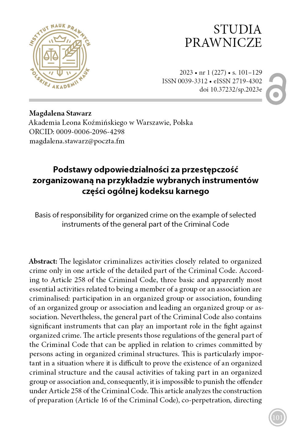 Ustawodawca kryminalizuje działania ściśle związane z przestępczością zorganizowaną w jednym przepisie części szczególnej kodeksu karnego. Zgodnie z art. 258 k.k. za przestępstwa uznane zostały trzy podstawowe, i jak się wydaje, najistotniejsze czynności dla występowania tego typu przestępczości: branie udziału, zakładanie oraz kierowanie zorganizowaną grupą lub związkiem przestępczym. Niemniej jednak część ogólna kodeksu karnego również zawiera instrumenty mogące odegrać istotną rolę w zwalczaniu przestępczości zorganizowanej. Celem artykułu jest przedstawienie i analiza tych regulacji części ogólnej kodeksu karnego, które mogą mieć zastosowanie w odniesieniu do przestępstw popełnianych przez osoby działające w zorganizowanych strukturach przestępczych. Jest to szczególnie ważne w sytuacji, gdy utrudnione jest udowodnienie istnienia zorganizowanej grupy i związku przestępczego i uczestniczenia w nich, czego kryminalizację zapewniać ma art. 258 k.k., i w konsekwencji niemożliwe jest ukaranie sprawcy na podstawie tego przepisu. Niniejszy artykuł analizuje formę stadialną przygotowania (art. 16 k.k.), a także formy zjawiskowe współsprawstwa, sprawstwa kierowniczego, sprawstwa polecającego, podżegania i pomocnictwa (art. 18 k.k.) w kontekście ich roli, przydatności i możliwości zastosowania w celu zwalczania przestępczości zorganizowanej.