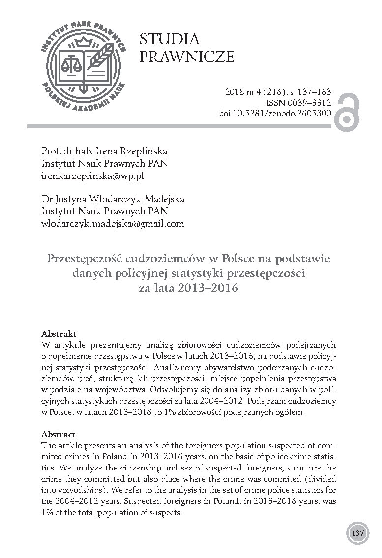 Przestępczość cudzoziemców w Polsce na podstawie danych policyjnej statystyki przestępczości za lata 2013–2016: [Crime of foreigners in Poland based on police crime statistics for the 2013–2016 years]. (2018). Studia Prawnicze The Legal Studies, 4 (216), 137-163. https://doi.org/10.37232/sp.2018.4.4