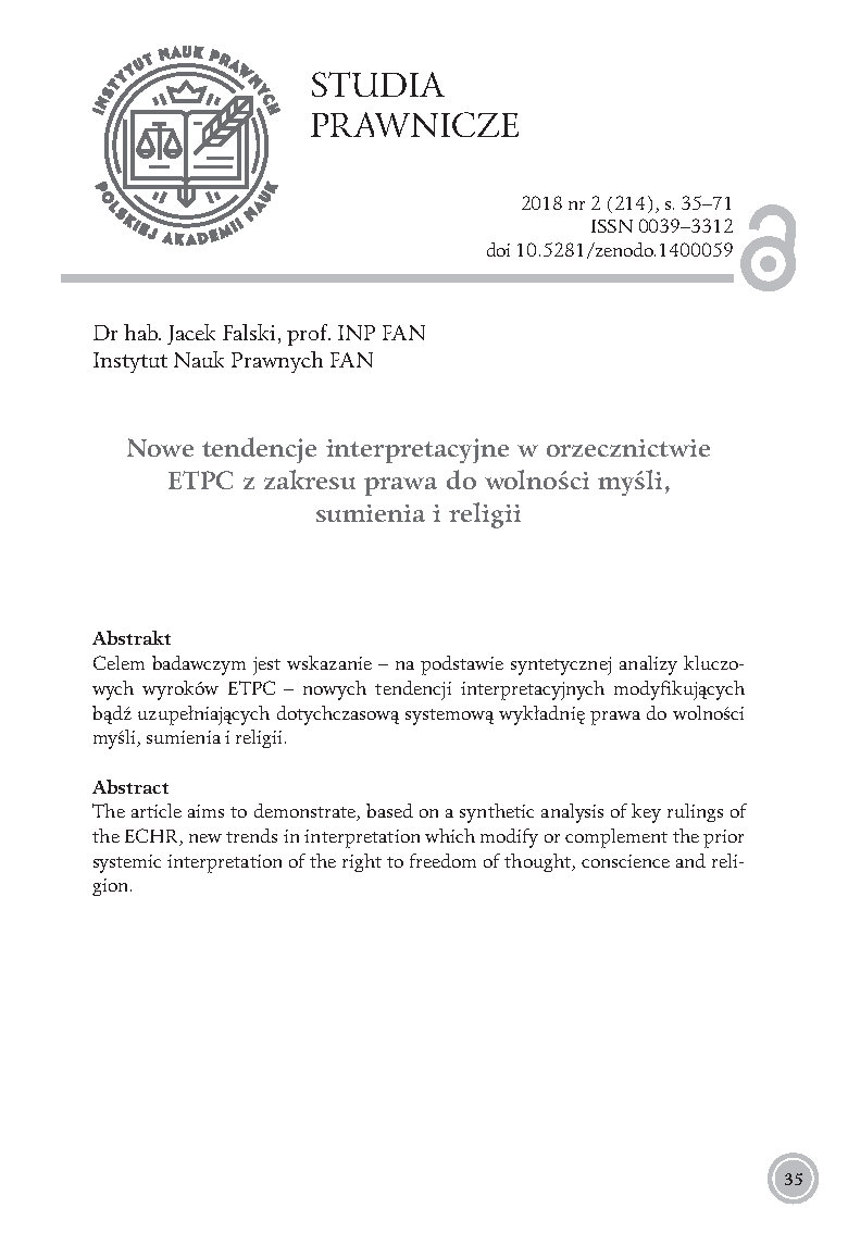Celem badawczym jest wskazanie – na podstawie syntetycznej analizy kluczowych wyroków ETPC – nowych tendencji interpretacyjnych modyfikujących bądź uzupełniających dotychczasową systemową wykładnię prawa do wolności myśli, sumienia i religii.