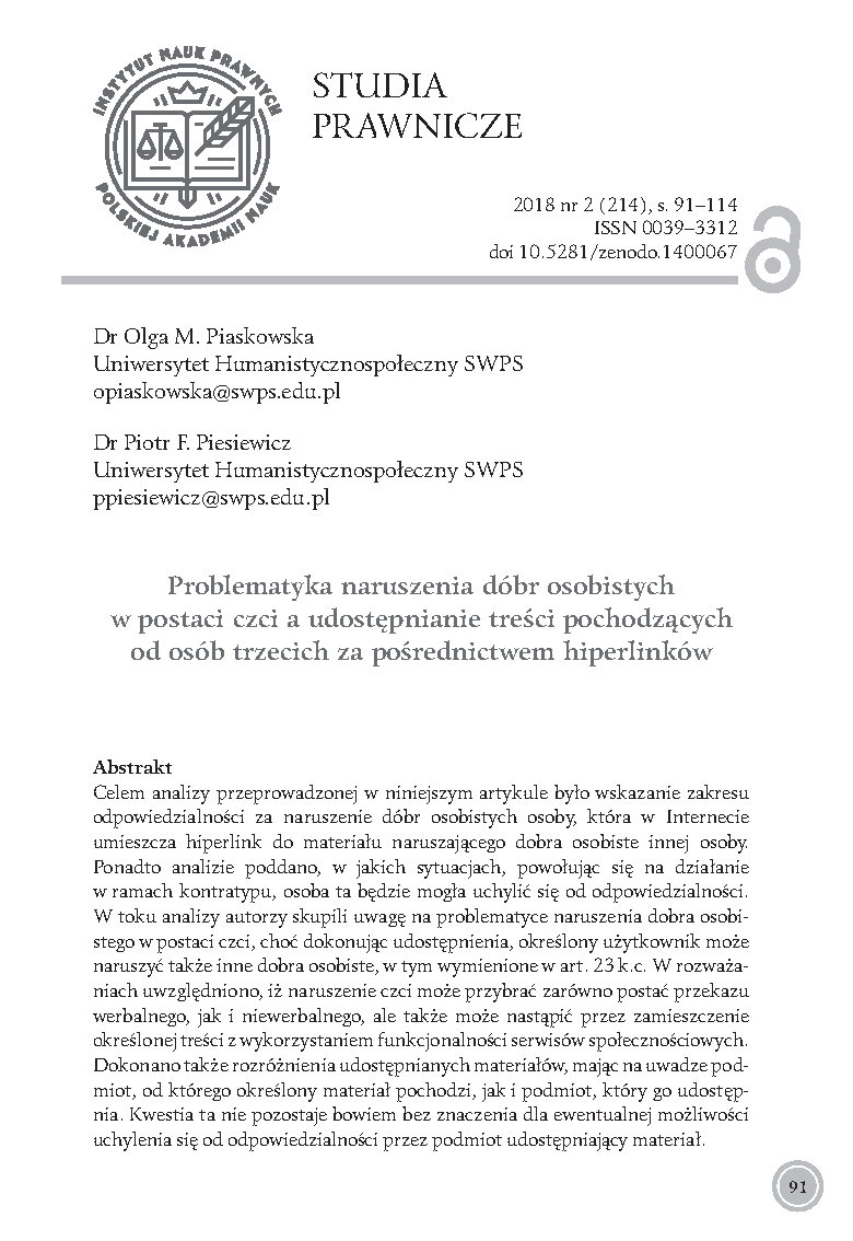 Problematyka naruszenia dóbr osobistych w postaci czci a udostępnianie treści pochodzących od osób trzecich za pośrednictwem hiperlinków: [The issue of infringement of dignity as a personal interests and problem of sharing content from third parties through hyperlinks]. (2018). Studia Prawnicze The Legal Studies, 2 (214), 91-114. https://doi.org/10.37232/sp.2018.2.4