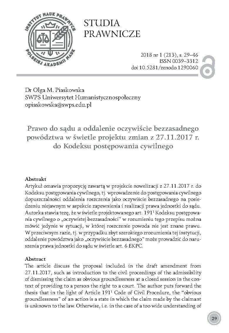 The article discuss the proposal included in the draft amendment from 27.11.2017, such as introduction to the civil proceedings of the admissibility of dismissing the claim as obvious groundlessness at a closed session in the context of providing to a person the right to a court. The author puts forward the thesis that in the light of Article 1911 Code of Civil Procedure, the “obvious groundlessness” of an action is a state in which the claim made by the claimant is unknown to the law. Otherwise, i.e. in the case of a too wide understanding of this institution, the dismissal of the action may lead to violation of the right of the individual to court in the light of Article 6 ECHR.
