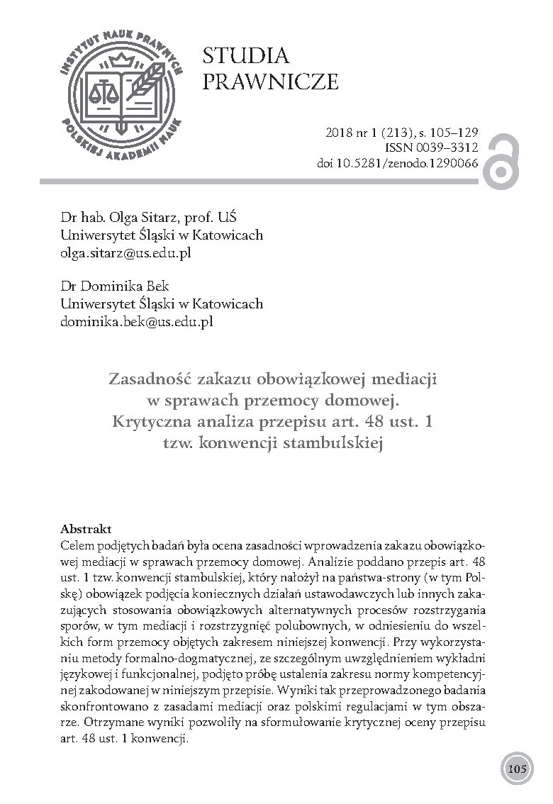 Celem podjętych badań była ocena zasadności wprowadzenia zakazu obowiązkowej mediacji w sprawach przemocy domowej. Analizie poddano przepis art. 48 ust. 1 tzw. konwencji stambulskiej, który nałożył na państwa-strony (w tym Polskę) obowiązek podjęcia koniecznych działań ustawodawczych lub innych zakazujących stosowania obowiązkowych alternatywnych procesów rozstrzygania sporów, w tym mediacji i rozstrzygnięć polubownych, w odniesieniu do wszelkich form przemocy objętych zakresem niniejszej konwencji. Przy wykorzystaniu metody formalno-dogmatycznej, ze szczególnym uwzględnieniem wykładni językowej i funkcjonalnej, podjęto próbę ustalenia zakresu normy kompetencyjnej zakodowanej w niniejszym przepisie. Wyniki tak przeprowadzonego badania skonfrontowano z zasadami mediacji oraz polskimi regulacjami w tym obszarze. Otrzymane wyniki pozwoliły na sformułowanie krytycznej oceny przepisu art. 48 ust. 1 konwencji.