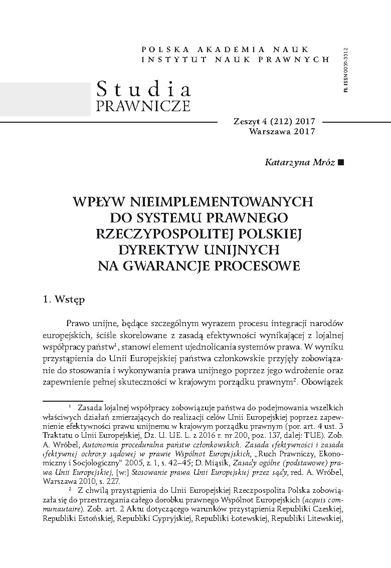This article deals with the issue of the direct effect of EU instruments from the point of view of the constitutional system of sources of law. Ensuring the „effet utile” of Community law entails the requirement for the effective realization of the subjective rights resulting from that right. Undoubtedly the effects of breaching obligations to implement EU law, in particular the obligation to transpose draft legislation, affect a certain level of process guarantees. An in-depth analysis of the minimum standards of the rights of suspects and defendants in criminal proceedings prompts reflection on the impact of the directives not implemented in the legal system on defining the rights of defense. The discussion on this subject will be presented in the context of the regulation contained in Directive 2013/48/EU of the European Parliament and of the Council of 22 October 2013 on the right of access to a lawyer in criminal proceedings and in European arrest warrant proceedings, and on the right to have a third party informed upon deprivation of liberty and to communicate with third persons and with consular authorities while deprived of liberty.