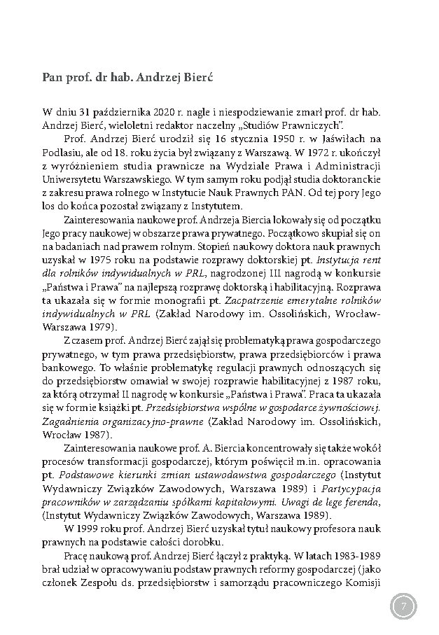 On October 31, 2020, prof. dr hab. Andrzej Bierć, longtime editor-in-chief of "Studia Prawnicze" died suddenly and unexpectedly. The publication contains a mention of the Professor along with a list of his publications.