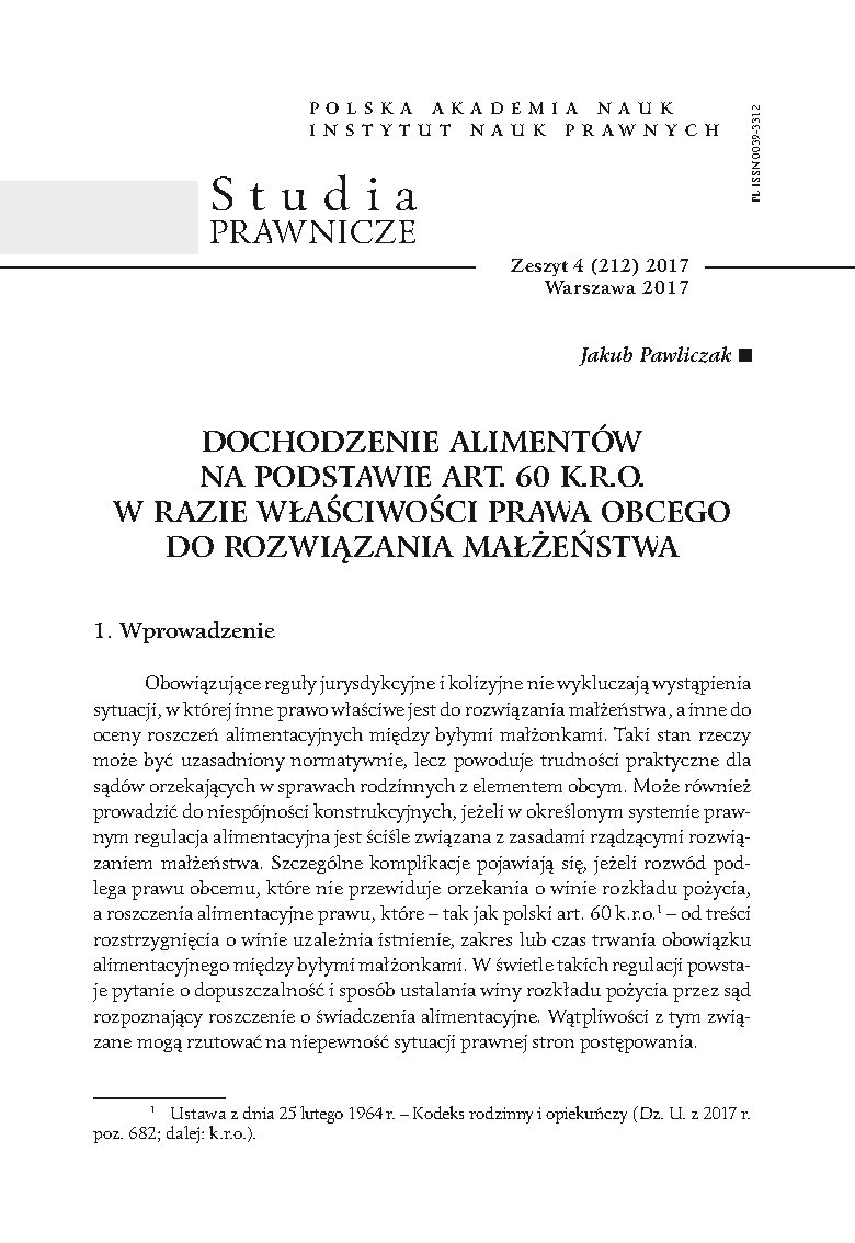 The applicable rules on jurisdiction and conflict of laws do not preclude situations in which the law of one country governs dissolution of the marriage, while the law of the other is applicable to the alimony claims between the former spouses. These kinds of rules cause difficulties for courts resolving family disputes, if in a particular legal system the regulation on maintenance between formers spouses is closely linked to the rules governing dissolution of marriage. Further complications occur when the law governing the divorce does not provide for ruling on the matrimonial fault and the maintenance claims are governed by the law, under which, like in the case of article 60 of the Polish Family and Guardianship Code, the existence, extent or duration of the maintenance obligations between former spouses are dependent on the ruling on the fault. The principal aim of the article is to analyse legal issues related to claiming alimony on the basis of article 60 of the Polish Family and Guardianship Code, when the foreign law governs dissolution of the marriage. Due to the complex character of these issues international rules on jurisdiction and conflict of laws, as well as domestic rules of material and procedural character shall be analysed.