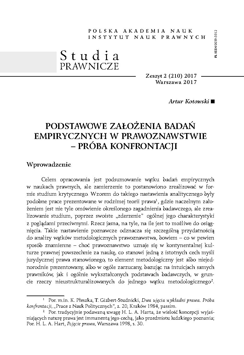 Celem opracowania jest podsumowanie wątku badań empirycznych w naukach prawnych, ale zamierzenie to postanowiono zrealizować w formie studium krytycznego. Wzorem do takiego nastawienia analitycznego były podobne prace prezentowane w rodzimej teorii prawa, gdzie naczelnym założeniem jest nie tyle omówienie określonego zagadnienia badawczego, ale zrealizowanie studium, poprzez swoiste „zderzenie”ogólnej jego charakterystyki z poglądami przeciwnymi. Rzecz jasna, na tyle, na ile jest to możliwe do osiągnięcia. Takie nastawienie poznawcze odznacza się szczególną przydatnością do analizy wątków metodologicznych prawoznawstwa, bowiem – co w pewien sposób znamienne – choć prawoznawstwouznaje się w kontynentalnej kul-turze prawnej powszechnie za naukę, co stanowi jedną z istotnych cech myśli jurydycznej prawa stanowionego, to element metodologiczny jest albo niejednorodnie prezentowany, albo w ogóle zarzucany, bazując na intuicjach samych prawników, jak i ogólnie wykształconych podstawach badawczych, w gruncie rzeczy nieustrukturalizowanych do jednego wątku metodologicznego.