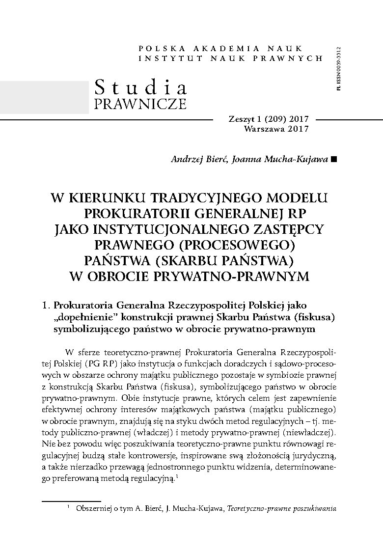 Zagadnienie zastępstwa prawnego (procesowego) państwa (skarbu państwa) w obrocie prywatno-prawnym ma szczególne znaczenie ze względu na konieczność efektywnej ochrony interesów majątkowych państwa (majątku publicznego). Autorzy, analizując sposoby prawnego zastępstwa państwa (skarbu państwa) na gruncie porządków europejskich wskazują, że zarówno instytucja skarbu państwa (fiskusa), jak i Prokuratorii Generalnej, to jest przedstawiciela ustawowego państwa (Skarbu Państwa) znajdują się na styku dwóch metod regulacyjnych: metody publiczno-prawnej (władczej) i metody prywatno-prawnej (niewładczej) i są definiowane z różnym natężeniem obu wskazanych metod. Na gruncie prawa krajowego teoretyczno-prawne poszukiwania punktu równowagi regulacyjnej tych instytucji koncentrowały się do niedawna na metodzie niewładczej (prywatno-prawnej). Obecnie zauważa się dążenie do nadania krajowym konstrukcjom prawnym, symbolizującym państwo w obrocie prywatno-prawnym, odpowiedniej spójności (integralności) w ramach całego systemu prawnego, a nie tylko jednej gałęzi prawa. Dominuje spojrzenie o charakterze publiczno-prawnym, traktujące państwo jako osobę prawa publicznego, stanowiącą pod względem funkcjonalnym integralną całość (imperium i dominium). Dopełnieniem konstrukcji zdecentralizowanego Skarbu Państwa jest de lege lata Prokuratoria Generalna Rzeczypospolitej Polskiej, będąca instytucjonalnym (w postaci urzędu państwowego) zastępcą prawnym (procesowym) Skarbu Państwa (fiskusa), nawiązująca swym kształtem organizacyjno-prawnym do tradycyjnego modelu tej instytucji, funkcjonującego dawniej w polskim systemie, a także mającego swój odpowiednik w systemie organów Austrii.