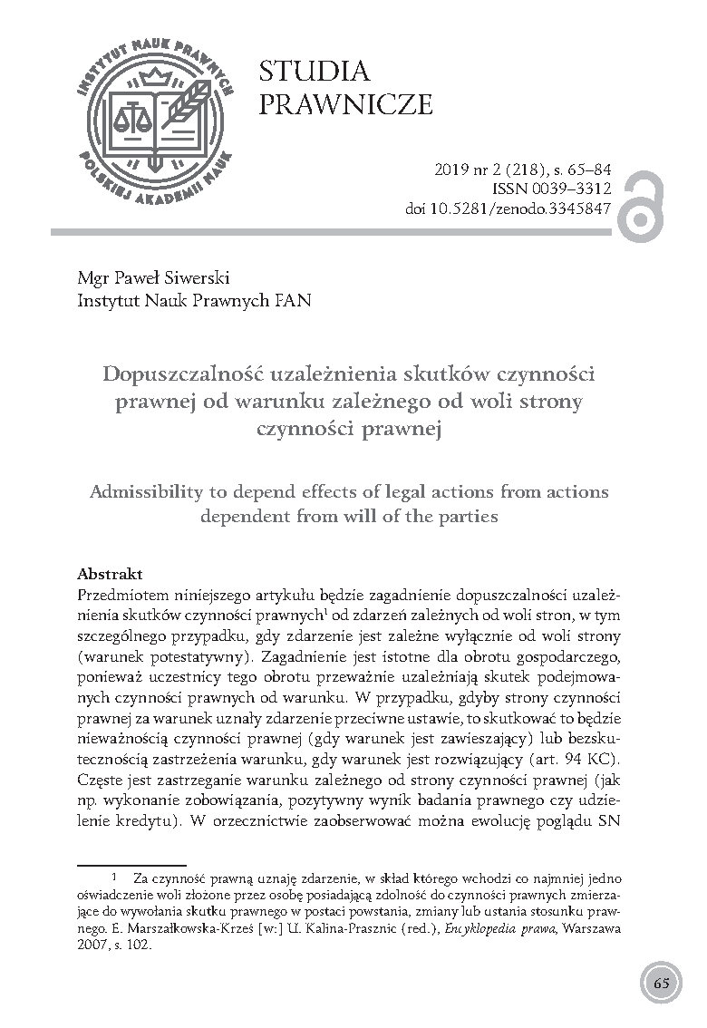 Przedmiotem niniejszego artykułu będzie zagadnienie dopuszczalności uzależnienia skutków czynności prawnych od zdarzeń zależnych od woli stron, w tym szczególnego przypadku, gdy zdarzenie jest zależne wyłącznie od woli strony (warunek potestatywny). Zagadnienie jest istotne dla obrotu gospodarczego, ponieważ uczestnicy tego obrotu przeważnie uzależniają skutek podejmowanych czynności prawnych od warunku. W przypadku, gdyby strony czynności prawnej za warunek uznały zdarzenie przeciwne ustawie, to skutkować to będzie nieważnością czynności prawnej (gdy warunek jest zawieszający) lub bezskutecznością zastrzeżenia warunku, gdy warunek jest rozwiązujący (art. 94 KC). Częste jest zastrzeganie warunku zależnego od strony czynności prawnej (jak np. wykonanie zobowiązania, pozytywny wynik badania prawnego czy udzielenie kredytu). W orzecznictwie zaobserwować można ewolucję poglądu SN od restrykcyjnego (niedopuszczającego warunku zależnego od woli strony) do stanowiska liberalnego, dopuszczającego uznanie powstania lub ustania skutku czynności prawnej od warunku zależnego od strony czynności prawnej .