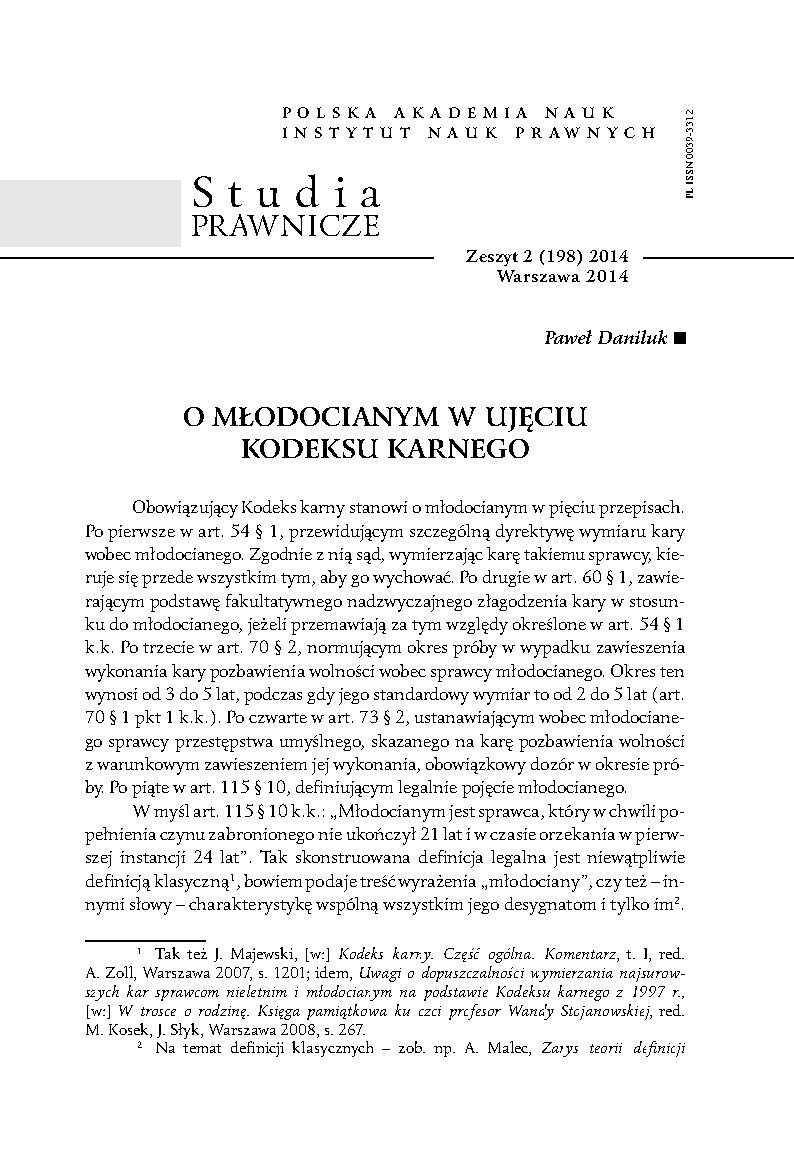 The article is devoted to a specific category of offenders i.e. juveniles. Firstly, the legal definition of the juvenile, provided under Art. 115 § 10 of the Criminal Code, is analyzed, making a distinction between the notion of the juvenile and the notion of the minor. Then the grounds for the special treatment of juvenile offenders are examined. A special attention is paid to the presumption of lesser degree of juvenile’s guilt and their susceptibility to be affected, which constitutes a good prospect for their education (reformation, reclamation). Finally, the criteria on the basis of which it is established whether an offender is a juvenile offender or not, are analyzed. A special attention is given to the criterion which states that a juvenile is an offender who has not reached the age of 24 years at the time of the trial in the first instance.