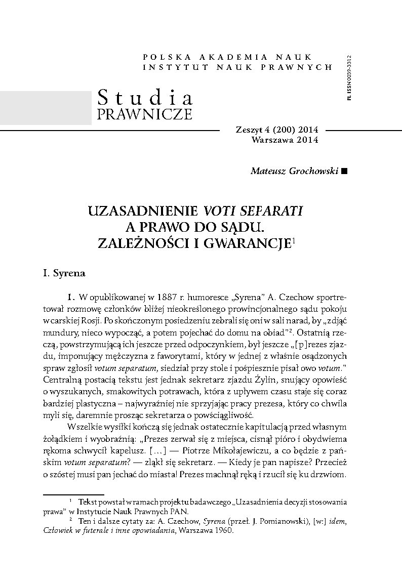 The text provides an insight into the relation between the formal motives (justifycation) of votum separatum in judicial proceedngs and a right to due process. Because of to the complex axiological and functional character of the motives of judge’s dissent, the interdependence in question is not obvious, nor clear. Weakening the stability and social prestige of the judgment, as well as breaking the confidency of judges’ dispute, the votum separatum (mainly through its motives) contributes simultaneously to improving the overall quality of discourse accompanying application of law. It provides new points of reference that can or ought to be addressed at a few levels – within the grounds of the judgment (against which the dissent has been directed), by the court of higher instance, by other courts, as a „quasi-precedential” ruling, etc. For that reasons, although the separate opinion is not an obviouness for the legal system, introduction of this instrument entails quite automatically a need for a duty to justify it.