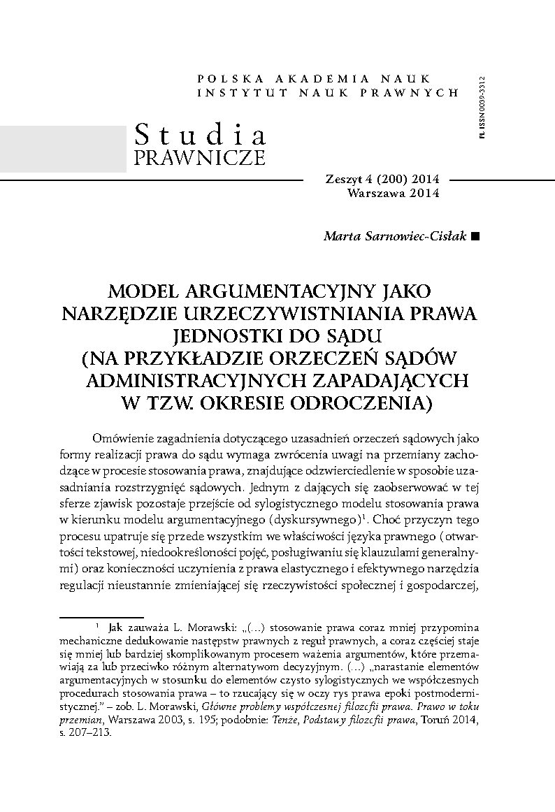 Model argumentacyjny jako narzędzie urzeczywistniania prawa jednostki do sądu (na przykładzie orzeczeń sądów administracyjnych zapadających w tzw. okresie odroczenia): [Argumentative model as an instrument of realization of right to fair trial (on the example of administrative court judgements in the so-called deferral period)]. (2014). Studia Prawnicze The Legal Studies, 4 (200), 73-85. https://doi.org/10.37232/sp.2014.4.5