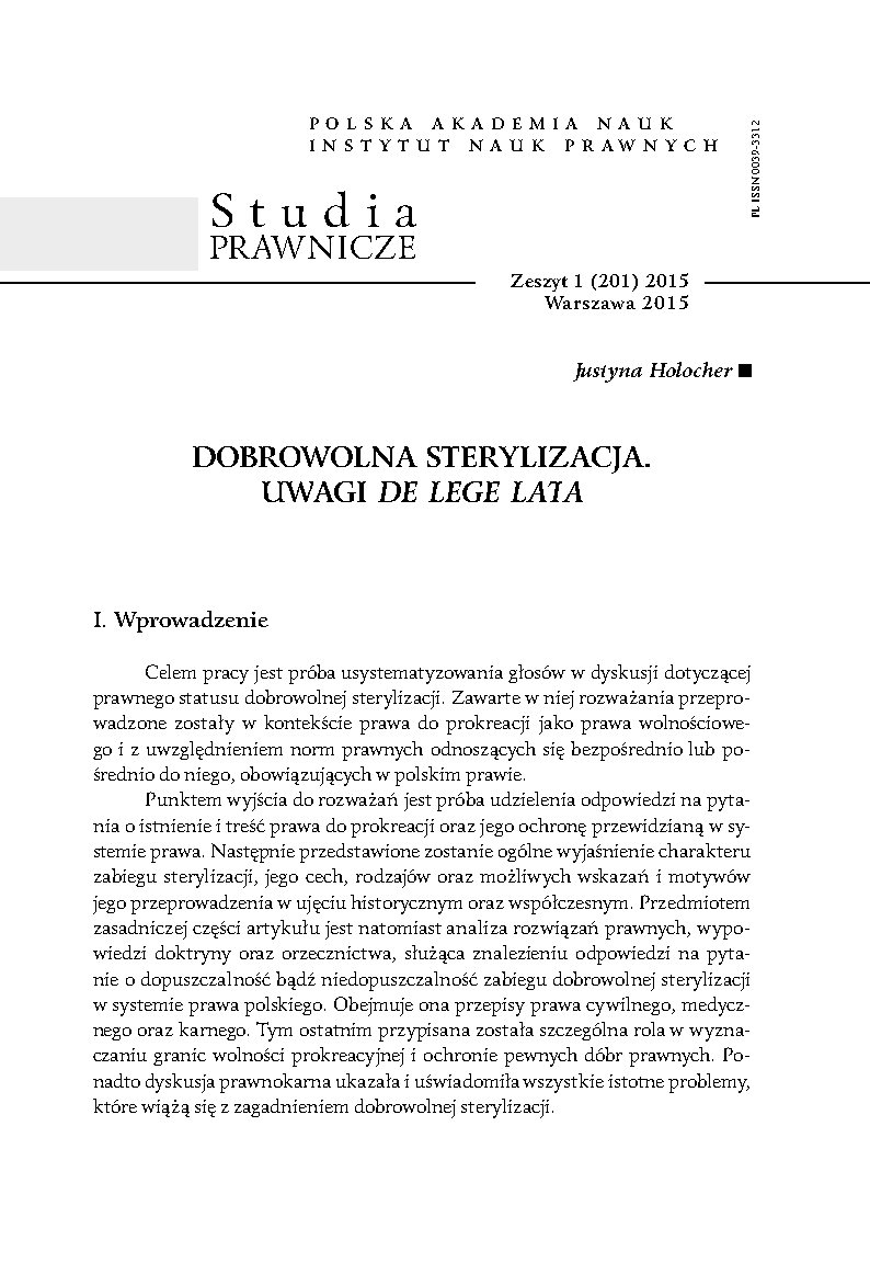Punktem wyjścia do rozważań jest próba udzielenia odpowiedzi na pytania o istnienie i treść prawa do prokreacji oraz jego ochronę przewidzianą w systemie prawa. Następnie przedstawione zostanie ogólne wyjaśnienie charakteru zabiegu sterylizacji, jego cech, rodzajów oraz możliwych wskazań i motywów jego przeprowadzenia w ujęciu historycznym oraz współczesnym. Przedmiotem zasadniczej części artykułu jest natomiast analiza rozwiązań prawnych, wypowiedzi doktryny oraz orzecznictwa, służąca znalezieniu odpowiedzi na pytanie o dopuszczalność bądź niedopuszczalność zabiegu dobrowolnej sterylizacji w systemie prawa polskiego. Obejmuje ona przepisy prawa cywilnego, medycznego oraz karnego. Tym ostatnim przypisana została szczególna rola w wyznaczaniu granic wolności prokreacyjnej i ochronie pewnych dóbr prawnych. Ponadto dyskusja prawnokarna ukazała i uświadomiła wszystkie istotne problemy, które wiążą się z zagadnieniem dobrowolnej sterylizacji.