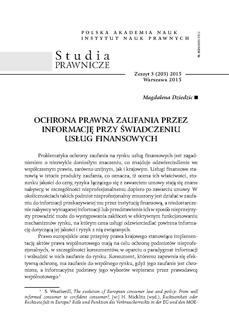 Problematyka ochrony zaufania na rynku usług finansowych jest zagadnieniem o niezwykle doniosłym znaczeniu, co znajduje odzwierciedlenie we współczesnym prawie, zarówno unijnym, jak i krajowym. Usługi finansowe stanowią w istocie produkty zaufania, co oznacza, iż ocena ich właściwości, stosunku jakości do ceny, ryzyka łączącego się z zawarciem umowy stają się znane nabywcy, w szczególności nieprofesjonalnemu dopiero po zawarciu umowy. W okolicznościach takich podmiot nieprofesjonalny zmuszony jest działać w zaufaniu do informacji przekazywanej mu przez instytucję finansową, a niedostarczenie nabywcy wymaganej informacji lub przedstawienie ich w sposób nieprzejrzysty prowadzić może do występowania zakłóceń w efektywnym funkcjonowaniu mechanizmów rynku, na którym cena usługi odzwierciedlać powinna informację dotyczącą jej jakości i ryzyk z nią związanych.