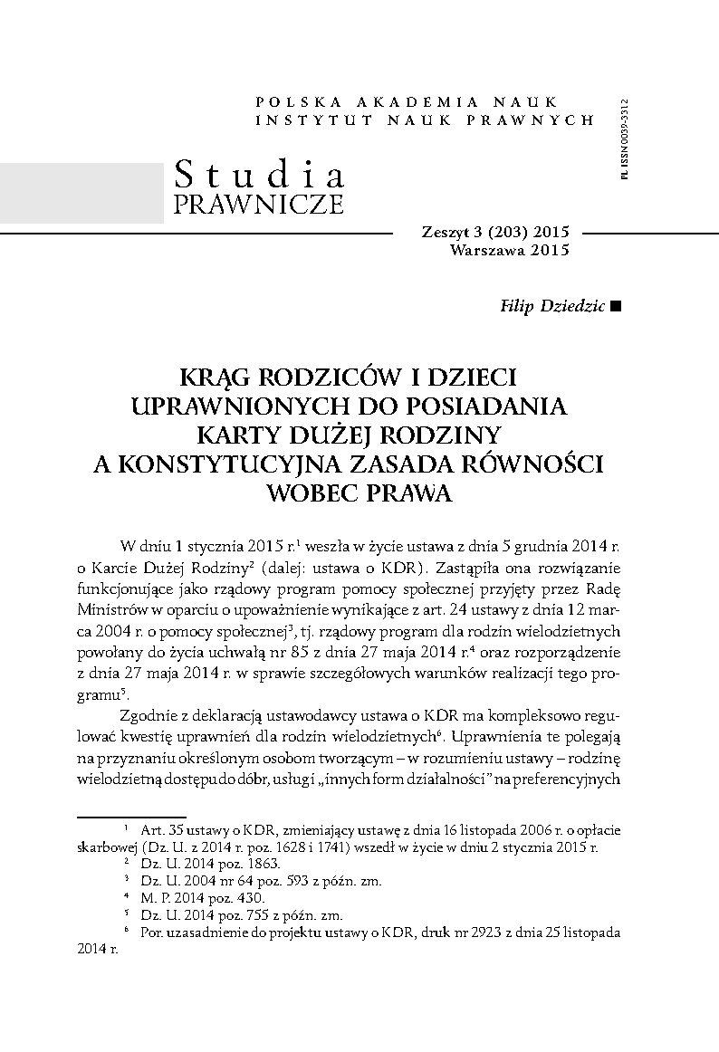 The subject of the article is the justification of the thesis that the differentiation of the legal situation of parents on the basis of the Act on the Large Family Card, who have established a family with at least three children violates the constitutional principle of equality before the law. On the one hand some parents are entitled to use the card without any time limit, and on the other hand there is a group of parents who also have large families, but are totally deprived of the right. According to the author of the article, the diversity does not represent any constitutionally protected value and the discrimination occurs due to the unlimited duration of the right to own the Card by eligible parents. The result of the above, as well as the fourth (another) child’s right to the Card depending on holding the Card by the parent, is discriminatory for the children born as the fourth (next) child in the family. The article is also an attempt to answer the question which way would be the best to remove the above-mentioned discrimination thus making it most coherent with the objective and content of the analyzed regulation.