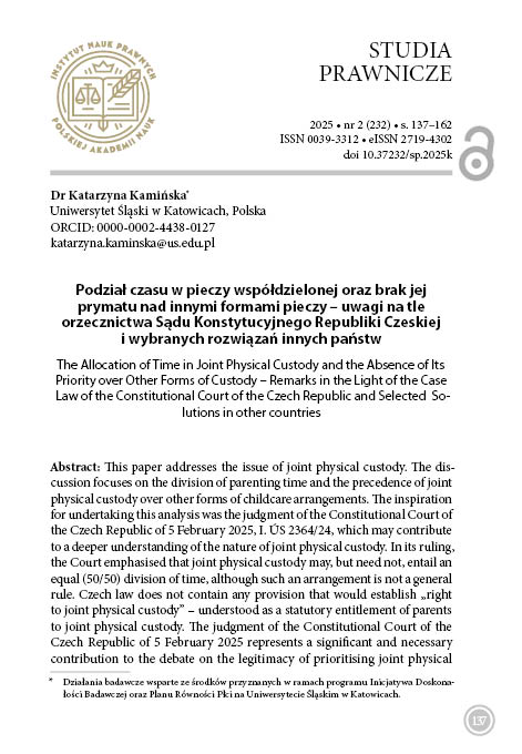 W artykule podjęto jeden z aspektów problematyki pieczy współdzielonej. W rozważaniach skoncentrowano się na podziale czasu oraz pierwszeństwie pieczy współdzielonej (lub jego braku) przed innymi formami sprawowania pieczy nad dzieckiem. Inspiracją do podjęcia niniejszych rozważań był wyrok Sądu Konstytucyjnego Republiki Czeskiej z 5 lutego 2025 r., I. ÚS 2364/24, który może przyczynić się do lepszego zrozumienia istoty pieczy współdzielonej. W wyroku wskazano, że piecza współdzielona może, ale nie musi, przyjmować model „pół na pół”, nie jest to regułą stosowaną automatycznie w każdym przypadku. W czeskim prawie nie istnieje żaden przepis, który konstytuowałby „prawo do pieczy współdzielonej” – rozumiane jako ustawowo gwarantowane uprawnienie rodziców do sprawowania pieczy współdzielonej. Wyrok Sądu Konstytucyjnego Republiki Czeskiej z 5 lutego 2025 r. jest ważnym i potrzebnym głosem w dyskusji dotyczącej zasadności priorytetu pieczy współdzielonej. Wnioski płynące z uzasadnienia wyroku mogą być pomocne z punktu widzenia polskiego prawa, ponieważ trwają zaawanasowane prace legislacyjne nad wprowadzeniem przepisów regulujących pieczę współdzieloną.